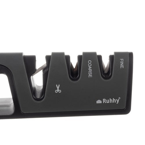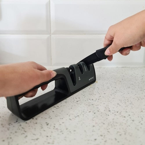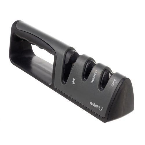 Keramisk knivslip 3-i-1 som hjälper till att snabbt återställa skärpan på både knivar och saxar. Det trefasiga slipningssystemet ger en effektiv slipprocess som passar för regelbundet underhåll i köket. Handtaget är utformat för ett stabilt grepp och de halkfria fötterna håller slipen på plats under användning. Formatet är kompakt och gör den enkel att lägga i en kökslåda eller ställa i ett skåp när den inte används. Ett praktiskt verktyg för att hålla köksredskap redo för vardagens matlagning.