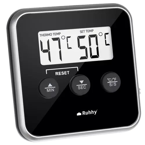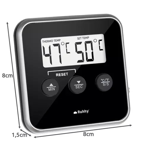 Digital kökstermometer med sond för exakt temperaturkontroll vid matlagning, grillning och rökning. LCD-displayen ger tydlig avläsning när du följer kärntemperatur i kött eller övervakar värme i ugn och grill. Temperaturområdet 0–250 °C gör den användbar i många moment, från långsam tillagning till snabb kontroll. Inbyggd timer och ljudlarm hjälper dig hålla koll på både tid och inställd måltemperatur. Magnetisk baksida gör att enheten kan fästas på metallytor nära arbetsytan.