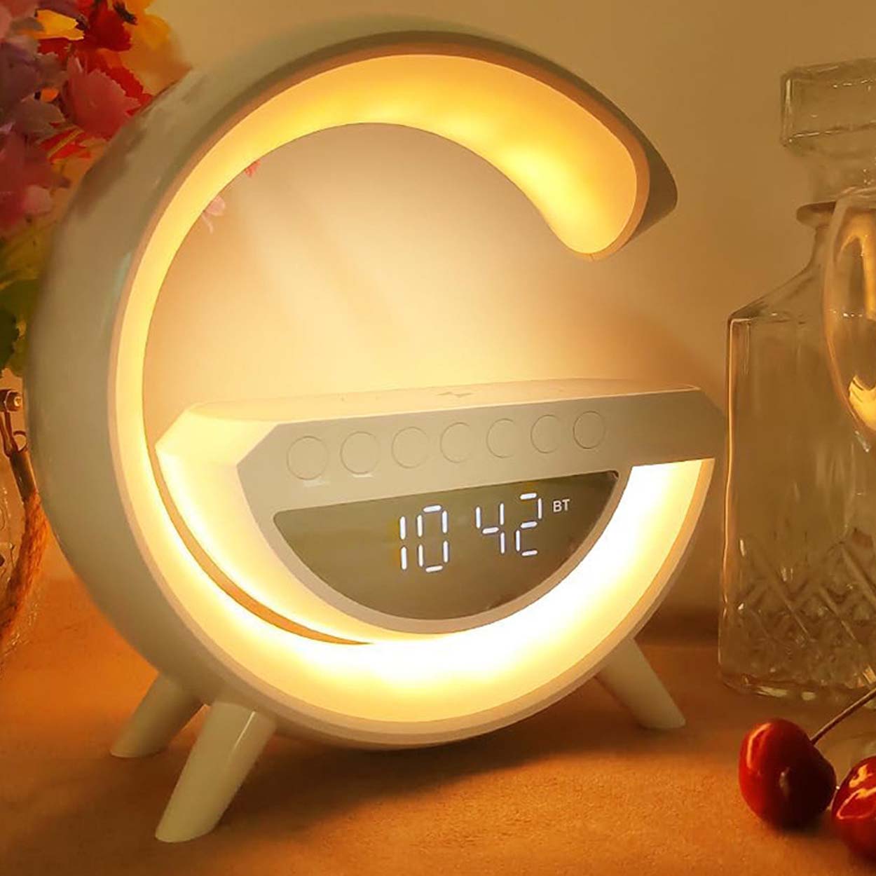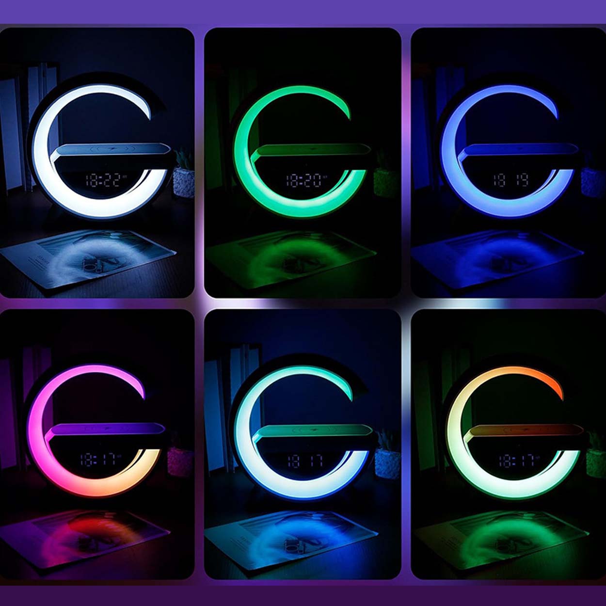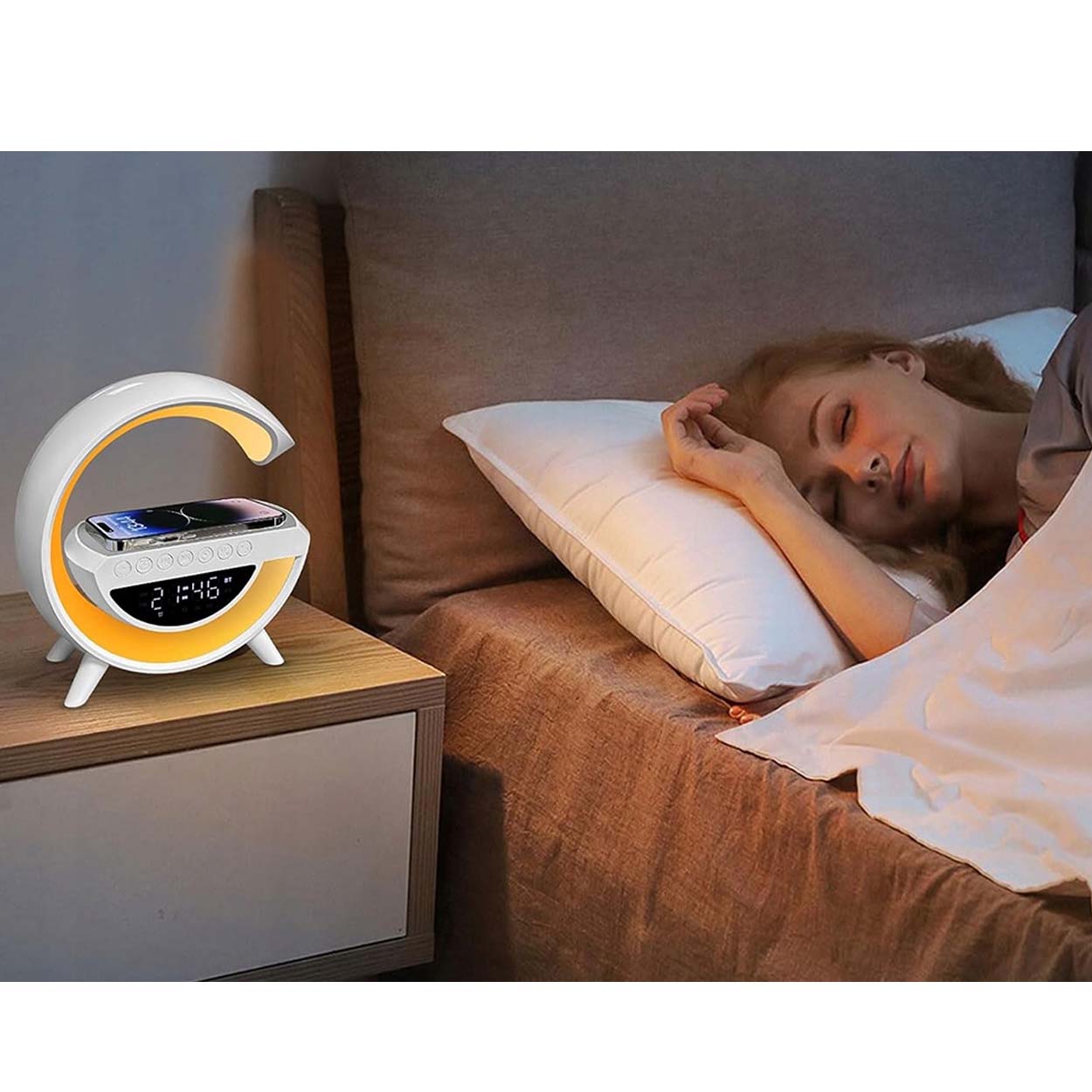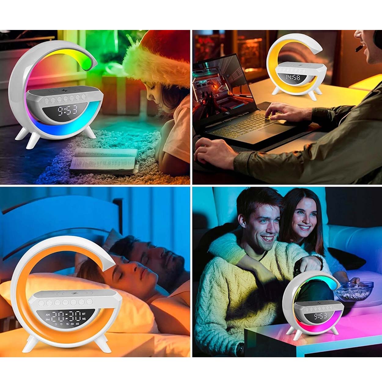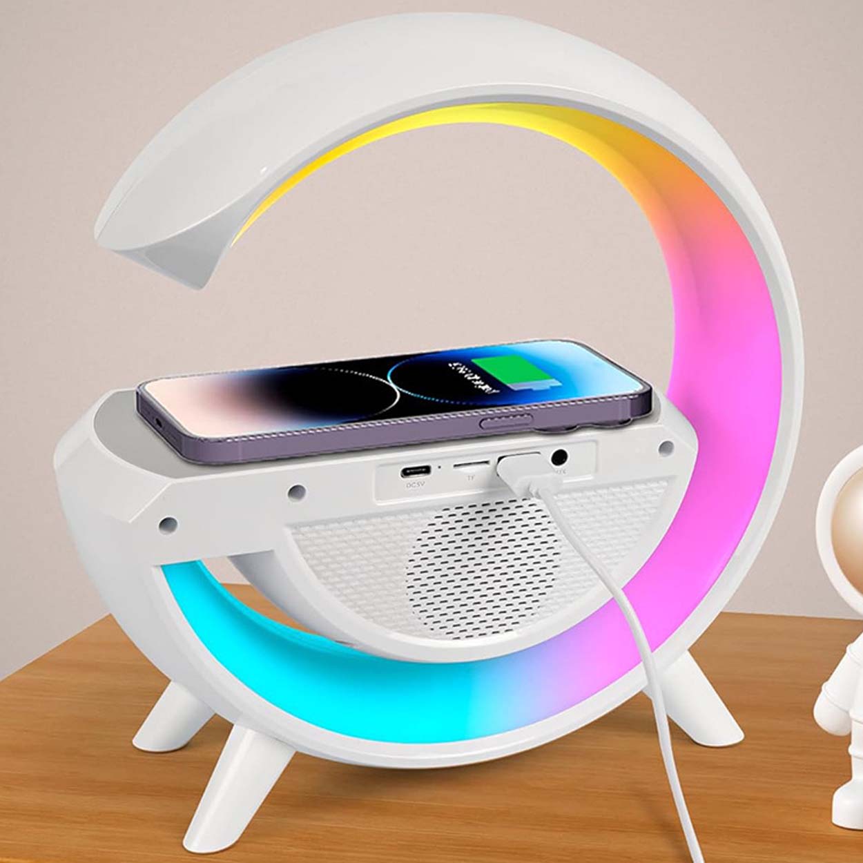 Trådlös laddare med integrerad RGB-nattlampa, bluetoothhögtalare och FM-radio för skrivbord eller sängbord. Qi-laddningen ger upp till 15 W för kompatibla smartphones och minskar behovet av kablar. Lampan har 13 RGB-ljuslägen som fungerar som stämningsljus eller mjuk nattbelysning. Bluetooth 5.3 ger stabil anslutning för musik, och högtalaren på 5 W passar för vardagslyssning. Ljud kan även spelas via FM-radio, TF-kort eller USB-minne. Inbyggd LED-klocka med alarm gör den praktisk i vardagen.