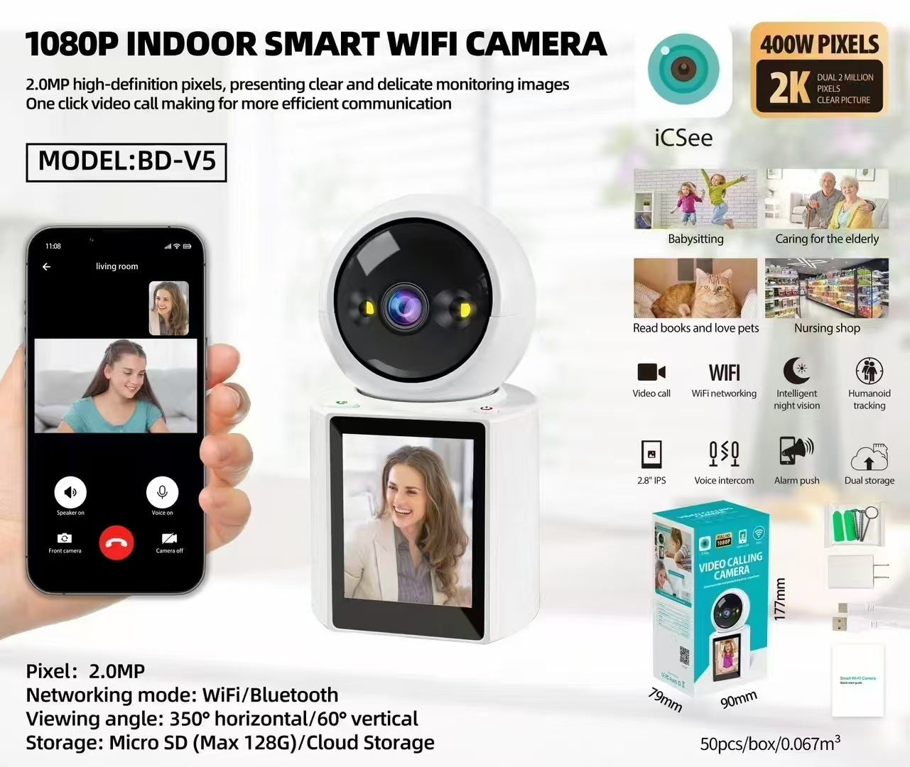 Smidig inomhuskamera för trygg övervakning av hemmet, barnen eller husdjuren. Den inbyggda skärmen gör det lätt att se och prata direkt via tvåvägsljud. WiFi‑anslutning och ICSee‑appen ger fjärråtkomst, aviseringar och enkel delning med familjen. Dual‑light nattseende ger klar bild i mörker upp till cirka 10 meter. Pan/tilt‑funktionen ger bred täckning i rummet, medan TF‑kort och molnlagring säkrar videon enligt behov. Kameran använder 3,6 mm‑lins och CMOS‑sensor för 1080p‑bild och placeras smidigt på bord eller hylla. Avsedd för inomhusbruk och strömförsörjs via nätadapter.
