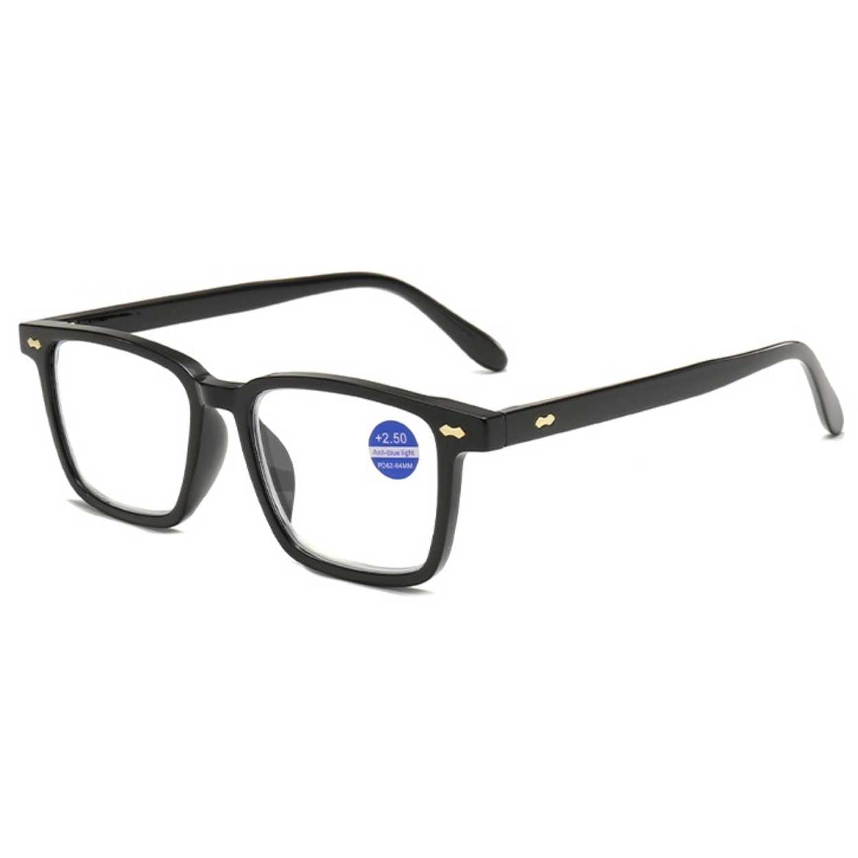 Läsglasögon med rektangulär form och integrerat blåljusfilter som reflekterar delar av det blå ljuset från skärmar. Passar för läsning, arbete vid dator och annan närseendeanvändning där ögonen lätt blir trötta. Finns i styrkorna +1.0, +2.0 och +3.0 för att matcha olika behov. Bågen har en balanserad vikt på 28,4 g och mått som ger en stabil passform: bredd 14,2 cm, skalmlängd 14,5 cm och brygga 2,0 cm.