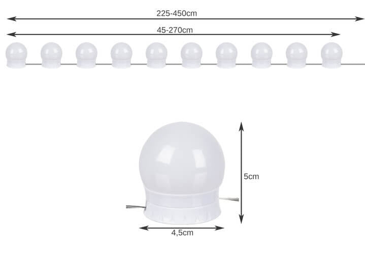 LED-spegellampor för sminkspegel som ger jämn belysning runt spegelytan. Ljuset kan växlas mellan varm, neutral och kall ton och dimras i flera nivåer via kontrollpanelen på kabeln. USB-drift på 5 V gör att lamporna kan anslutas till dator, nätadapter eller powerbank. Självhäftande fästen gör monteringen enkel utan verktyg. Kabeln är lång och lampavståndet kan justeras för att passa olika spegelstorlekar och placeringar.
