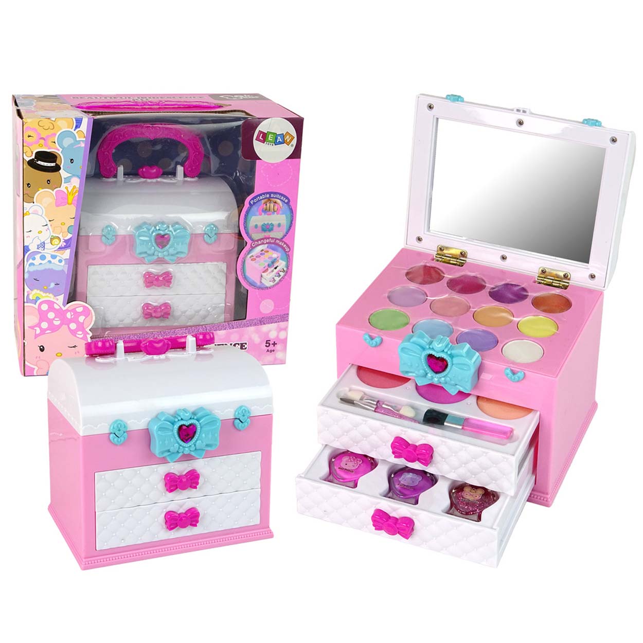Sminkset i resväska som gör det enkelt att leka stylist hemma eller på resa. Väskan har smarta lådor som håller ordning på innehållet och ett handtag som gör den lätt att bära. Setet innehåller 11 ögonskuggor, 4 läppglans, 3 borstar och 3 nagellack, samt en spegel för att kunna prova och titta på resultatet. CE-märkning och uppfyllnad av EN71 gör att produkten är anpassad för leksaksbruk. Rekommenderas från 5 år.