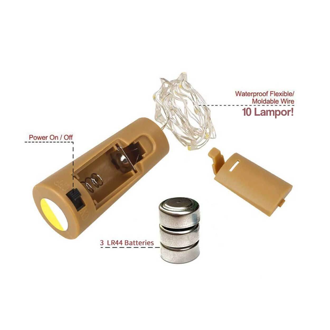 Batteridriven LED-ljusslinga för flaskdekoration med korkformad batteribox som passar vanliga glasflaskor. Slingan är 2 meter lång och har 20 LED-ljuskällor som ger ett varmt vitt sken. Den formbara kabeln gör det enkelt att placera ljuset i flaskor, burkar, blomsterarrangemang eller på dukningar. På/av-knapp sitter på korken för smidig hantering. Drivs av 3 LR44-knappcellsbatterier som ingår, vilket gör att ljusslingan kan användas direkt utan extern strömkälla.