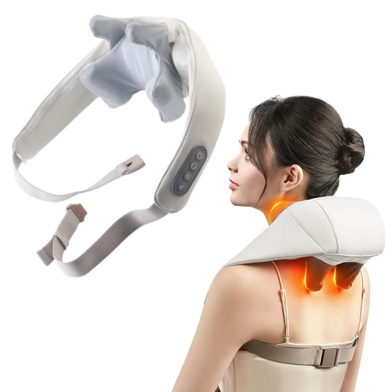 Nack- och axelmassager med shiatsu som knådar musklerna för att minska spänningar efter stillasittande arbete eller träning. Värmefunktionen hjälper till att mjuka upp stela områden och kan bidra till bättre cirkulation. Två intensitetsnivåer och två massagelägen gör det enkelt att anpassa känslan efter behov. Enheten är uppladdningsbar med 2000 mAh batteri och ger cirka 70 minuters användning per laddning. Inbyggd 10-minuters timer ger en jämn och kontrollerad behandling. Laddas via USB-C-kabel.