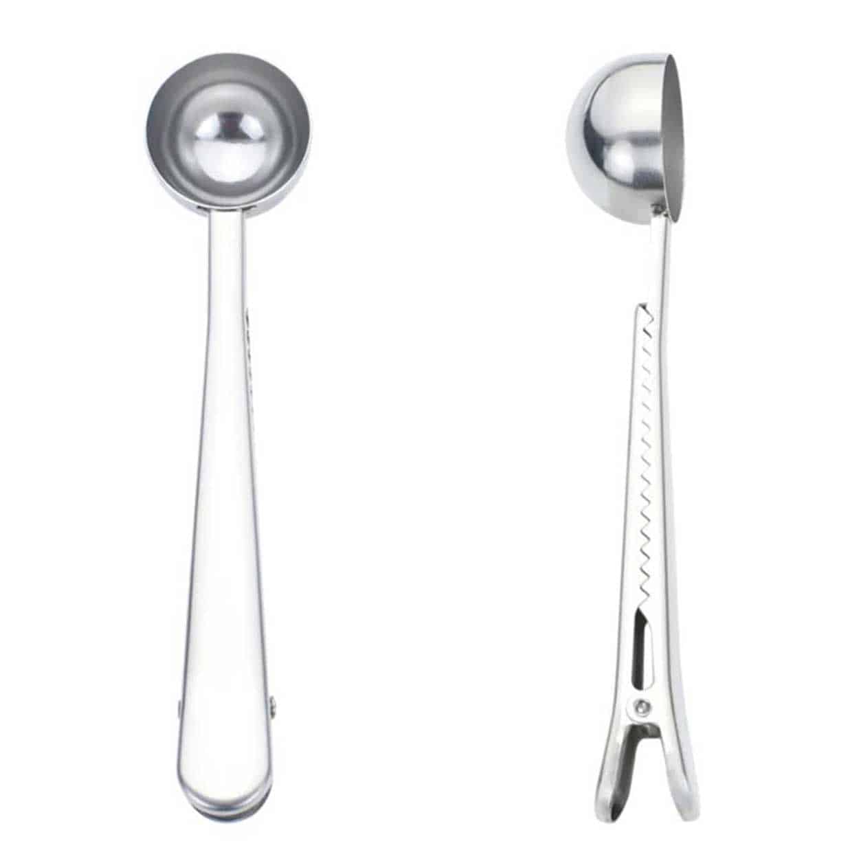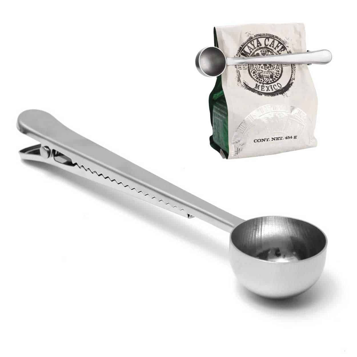 Sked och klämma Försluter kaffepåsar Rostfritt stål Tål diskmaskin