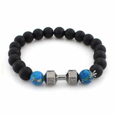 Hantelarmband med stenpärlor som ger ett rent och modernt uttryck. Pärlorna är 8 mm och sitter på ett stretchband som gör armbandet enkelt att ta på och bekvämt att bära under dagen. En hantelformad detalj i gunmetal skapar en tydlig mittpunkt, medan två accentpärlor ger en diskret kontrast. Passar som vardagsarmband och kan bäras ensamt eller tillsammans med andra armband för en mer uppbyggd look.