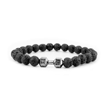 Handgjort armband med svarta lavastenpärlor och en metallhantel som ger ett tydligt, maskulint uttryck. Stretchad konstruktion gör armbandet enkelt att ta på och av och ger en följsam passform runt handleden. Pärlorna är 8 mm i diameter och ger en jämn, robust känsla utan att bli klumpig. Omkretsen är cirka 19–20 cm, vilket passar många handleder. En lätt accessoar som fungerar lika bra till vardags som till mer uppklädda tillfällen.