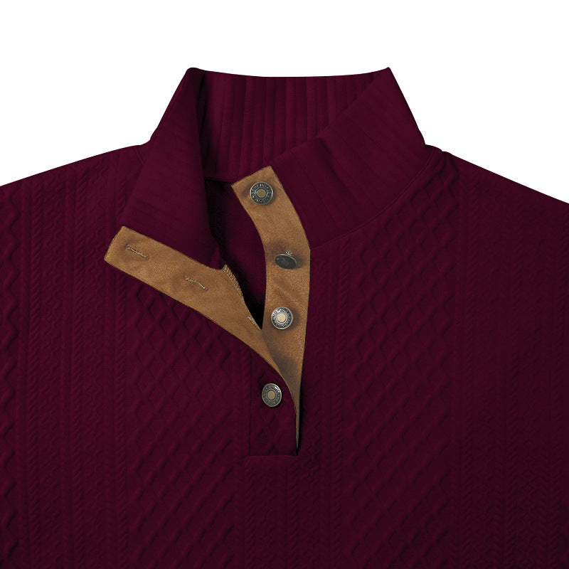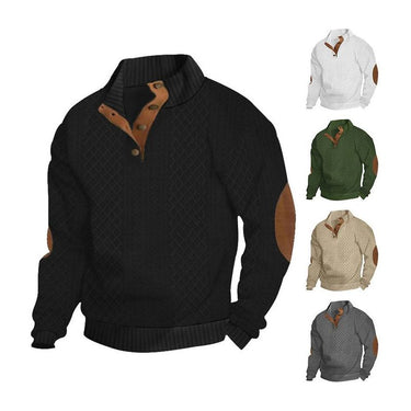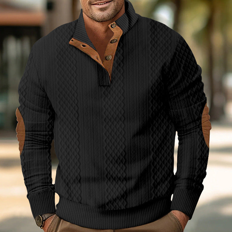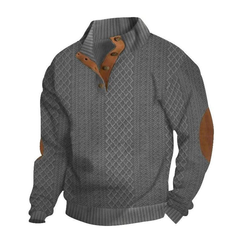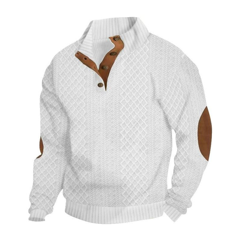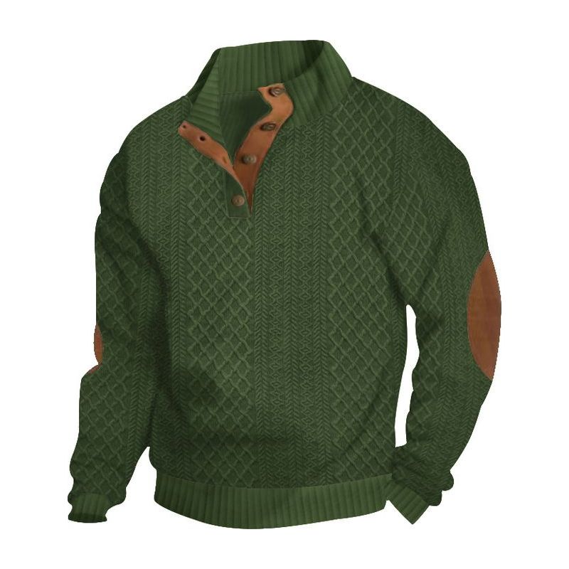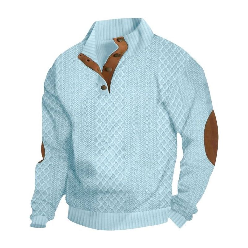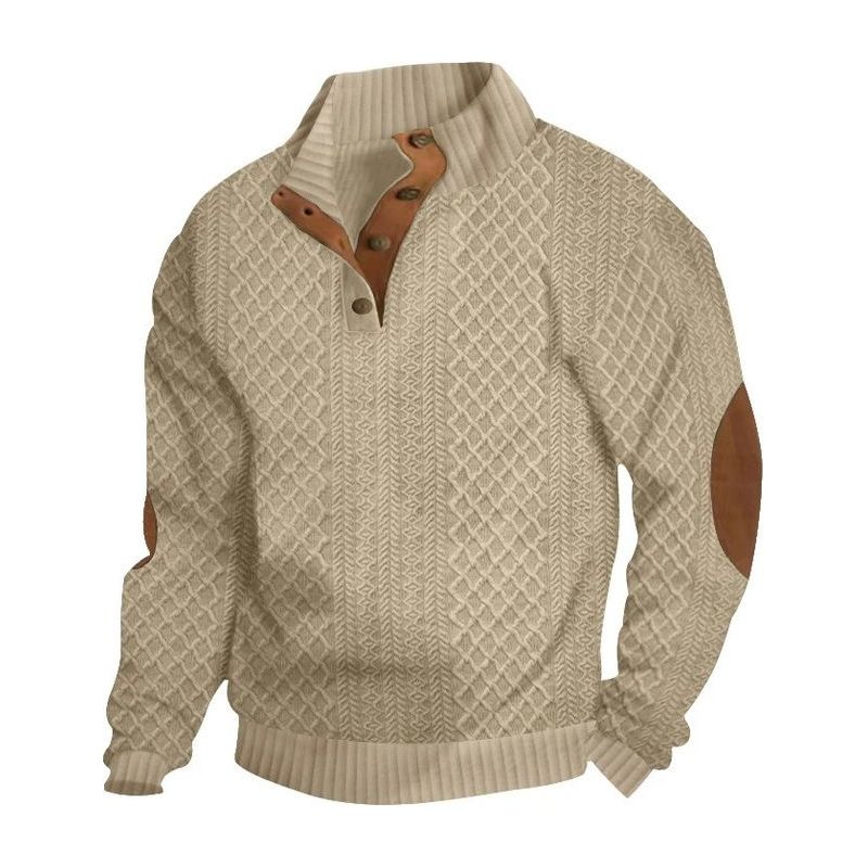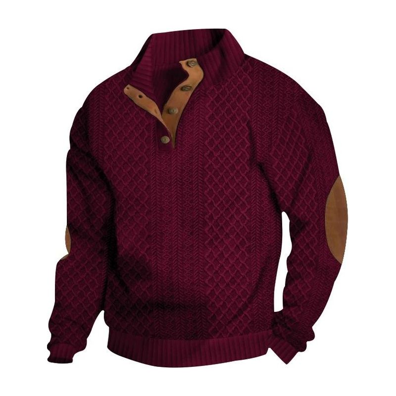 Sweatshirt i kraftigare jacquardstickning för vardag och fritid. Ståkragen med knappslå gör det enkelt att reglera värmen och ger ett mer sobert uttryck än en vanlig rund hals. Armbågslapparna förstärker utsatta partier och bidrar till längre livslängd vid frekvent användning. Materialet i polyester är mjukt, håller formen väl och fungerar smidigt som mellanlager under jacka. Passformen är kroppsnära för en ren siluett utan att kännas klumpig.