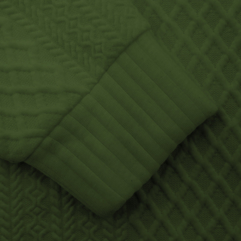 Jacquardstickning ger en tätare och mer strukturerad yta än enklare sweatshirtmaterial, vilket kan upplevas som stadigare och mer värmande. Polyester är formstabilt och torkar snabbt efter vädring eller tvätt, vilket gör plagget praktiskt för regelbunden användning.
