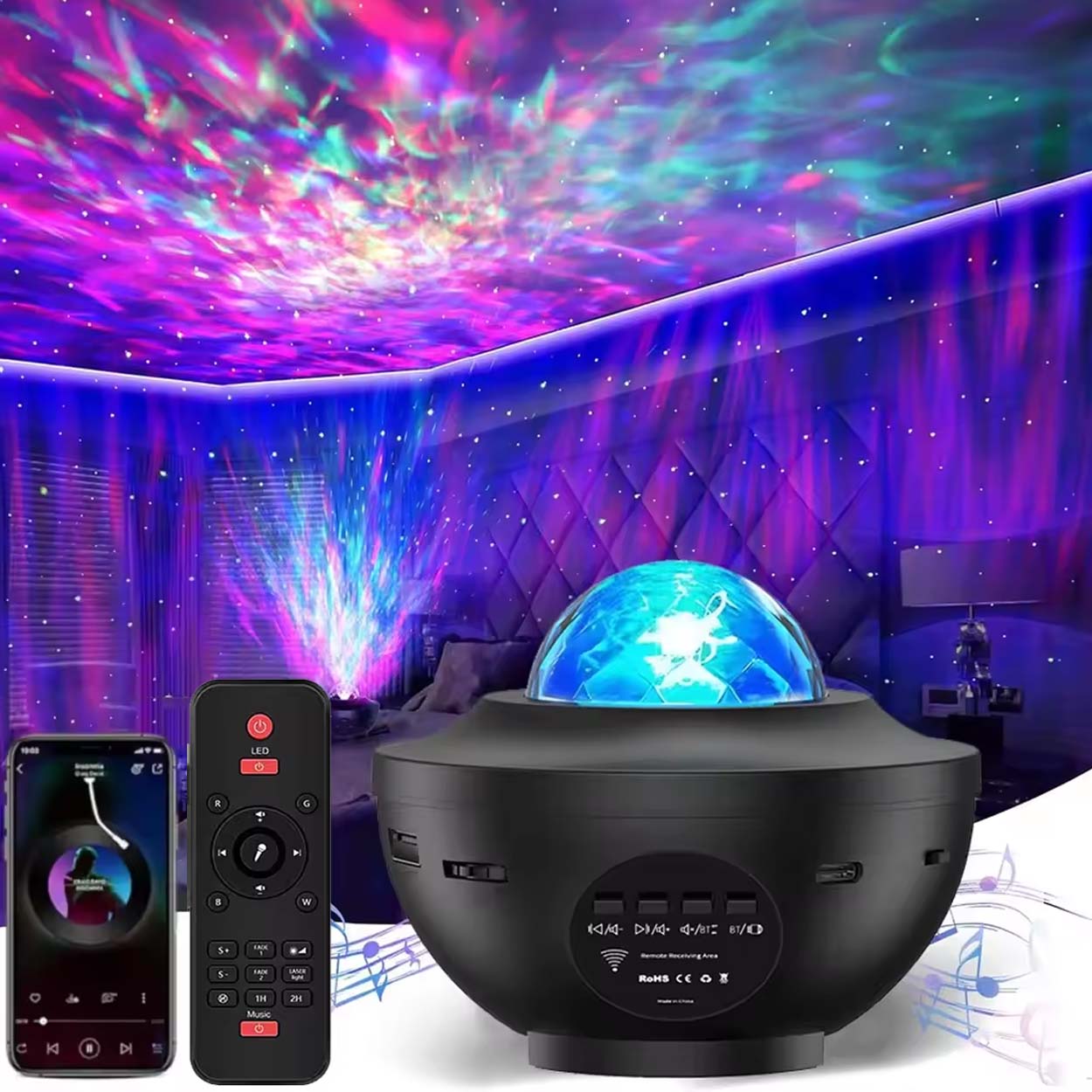 Stjärnprojektor / nattlampa – RGB ljuseffekter, bluetooth högtalare, fjärrkontroll, timer