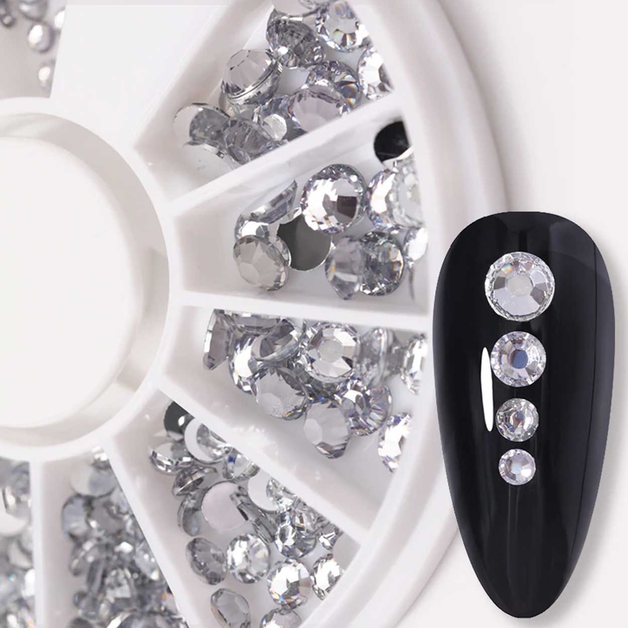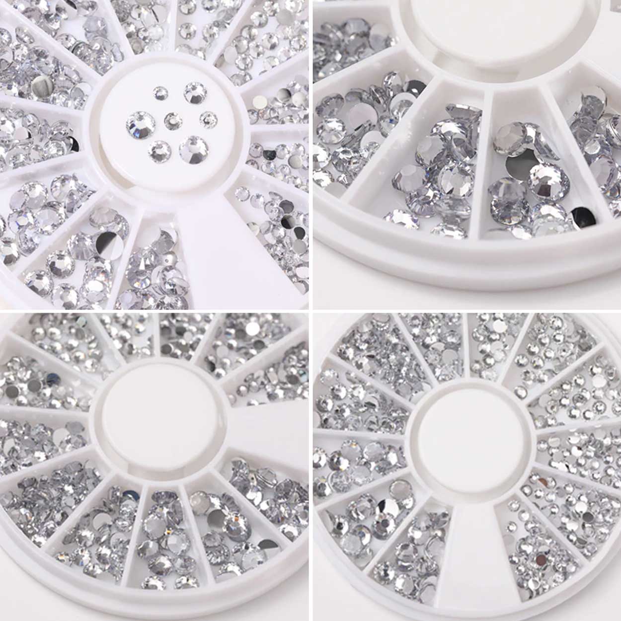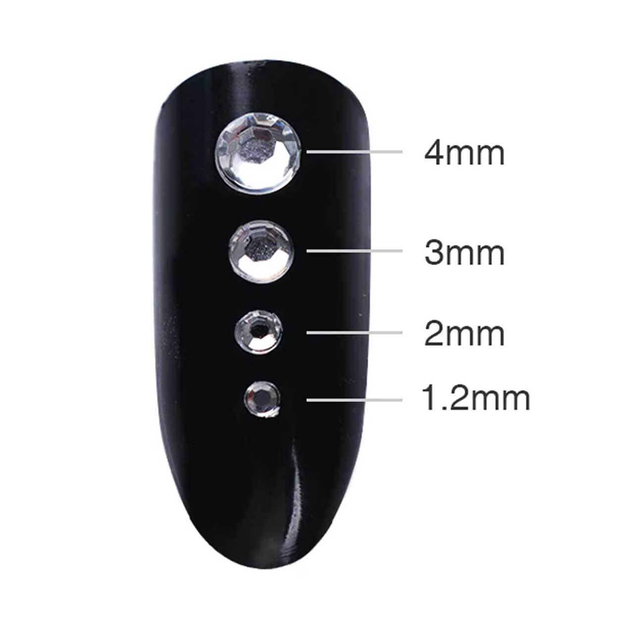 Rhinestones för nageldekor som gör det enkelt att skapa tydliga detaljer i din nail art. Kristallerna är sorterade efter storlek så att du snabbt kan välja rätt sten för accent, mönster eller kantlinjer. Fyra storlekar ingår: 1,2 mm, 2 mm, 3 mm och 4 mm, vilket ger bra kontroll från fin detalj till mer markerad dekoration. Fästs med nagellim eller gel beroende på metod och kan kombineras med andra dekorer för mer variation.