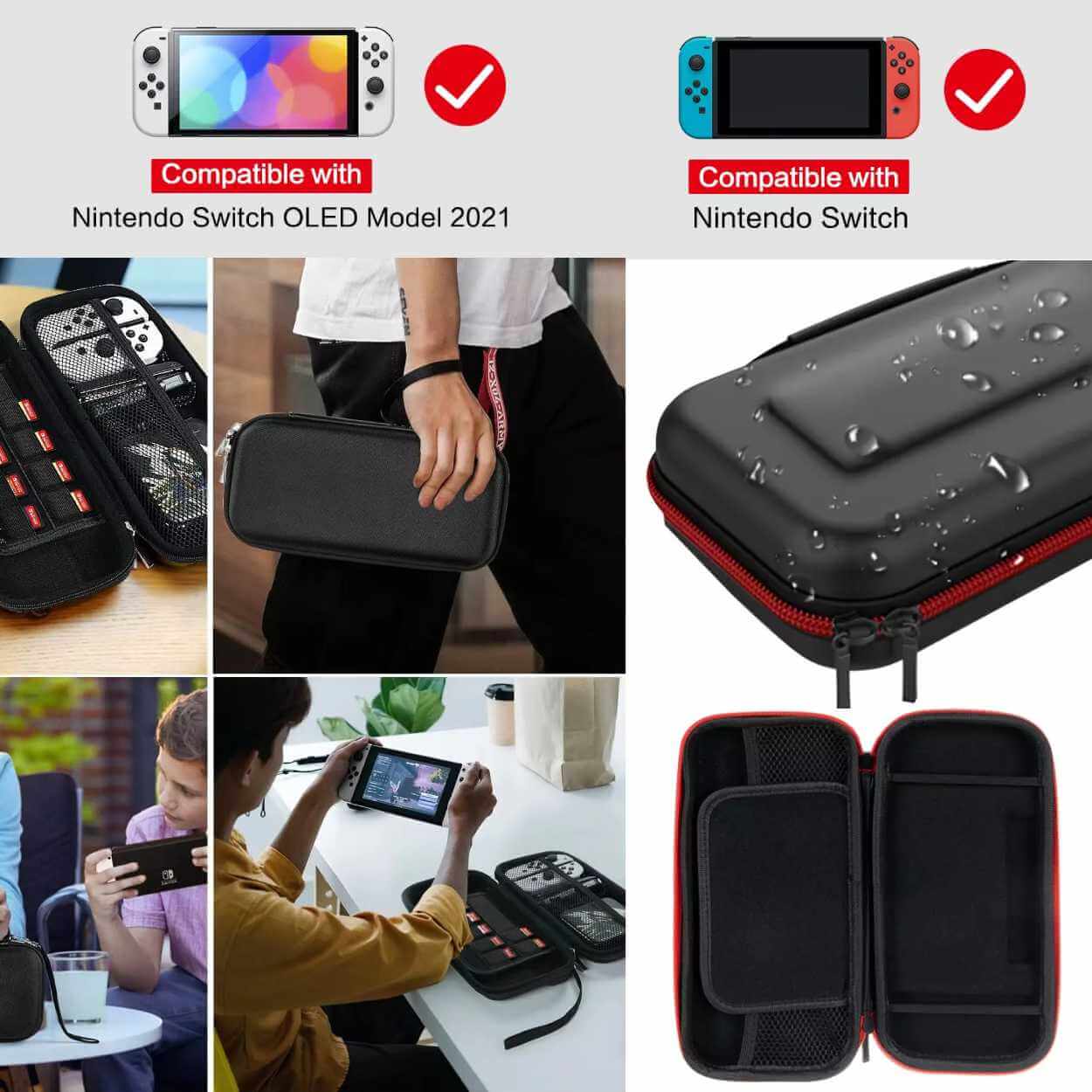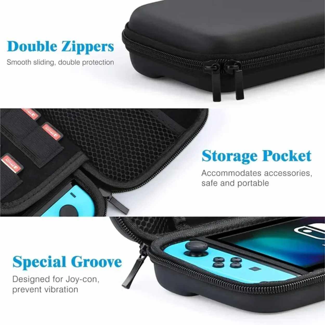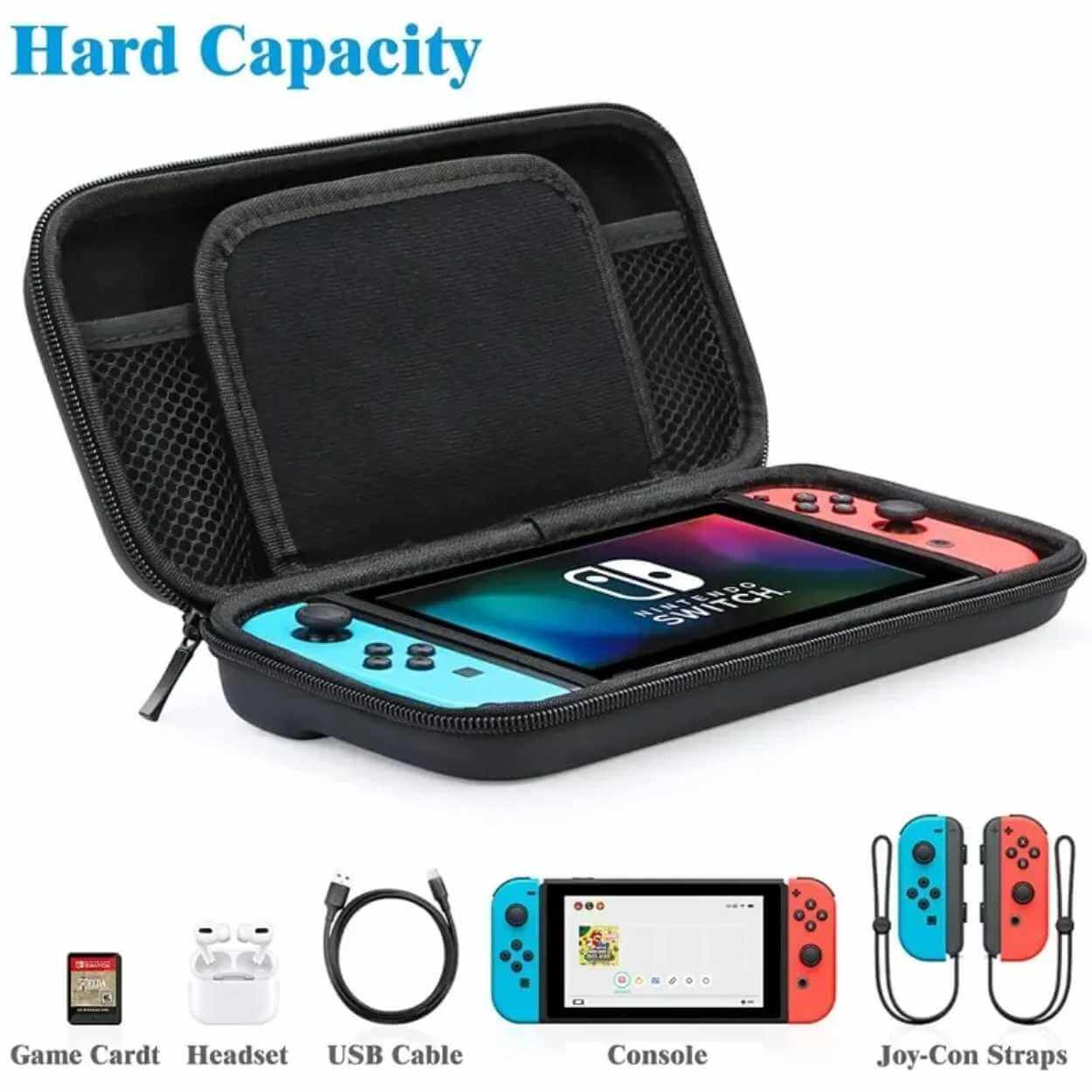 Hårdfodral för Nintendo Switch och Switch OLED som skyddar konsolen vid resa och förvaring. Förstärkt EVA-konstruktion hjälper till att ta upp stötar och skyddar mot damm och smuts. Insidan är mjuk för att minska risken för repor, och elastiska remmar håller konsolen stabilt på plats. Invändig meshficka ger organiserad förvaring för kablar, hörlurar och andra småtillbehör. Separat spelfack rymmer upp till 10 spelkassetter, så allt du behöver kan följa med i samma väska.