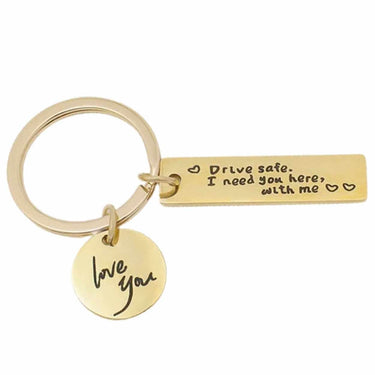 Nyckelring med ett tydligt budskap som påminner bilföraren om att köra säkert. Det rektangulära hänget har texten Drive safe, I need you here with me och kompletteras av ett runt hänge med Love you. Konstruktionen i rostfritt stål ger en tålig och vardagsanpassad nyckelbricka som klarar att följa med i ficka, väska och bilnycklar utan att kännas klumpig. Passar som personlig gåva när du vill skicka en enkel men tydlig hälsning.