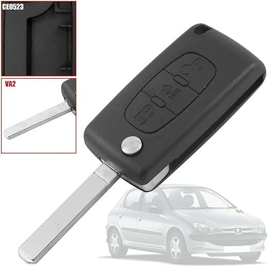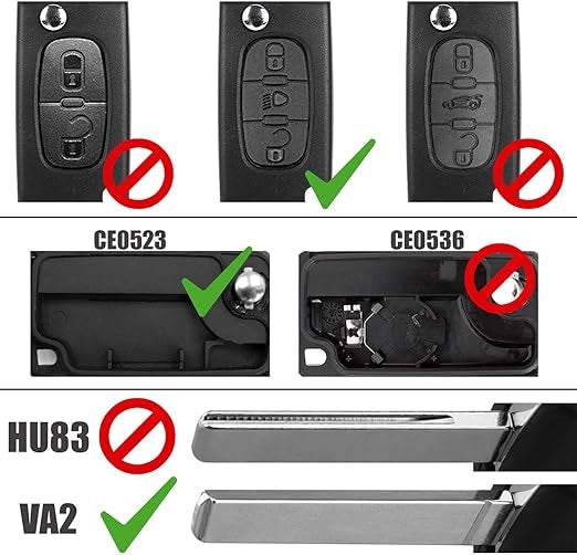 Skalet är avsett för nycklar där elektroniken fortfarande fungerar men höljet är skadat. Eftersom nyckelbladet är obearbetat behöver det vanligtvis fräsas för att passa bilen. Produkten är kompatibel med flera modeller inom Citroën och Peugeot samt vissa Fiat-modeller, men passform avgörs av nyckeltyp och intern layout snarare än bilmodell. Jämför därför knapparnas placering, nyckelbladstyp (VA2) och att din nyckel är CE0523 VA2 innan du flyttar över delarna. Om transpondern inte flyttas över kan bilen normalt inte starta.