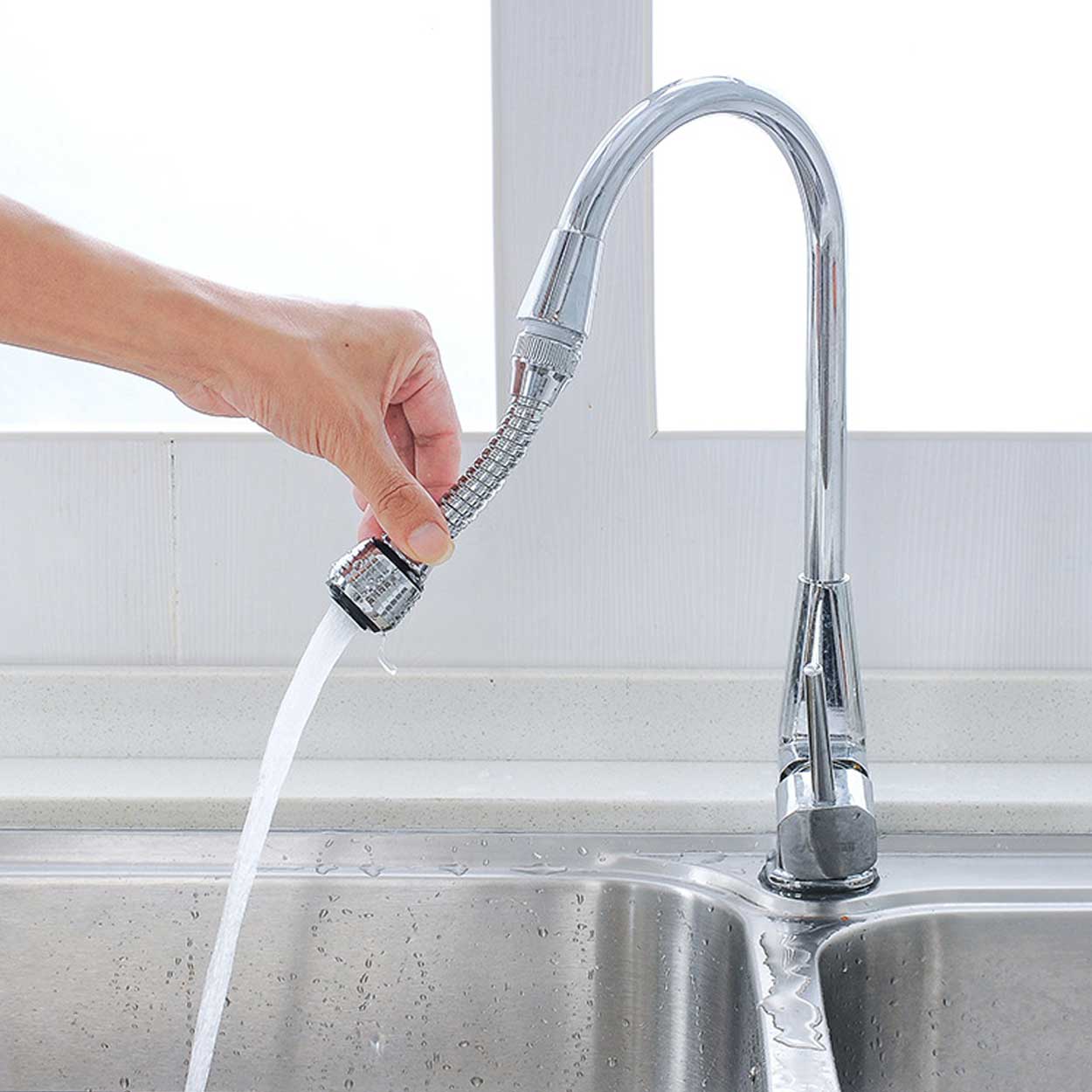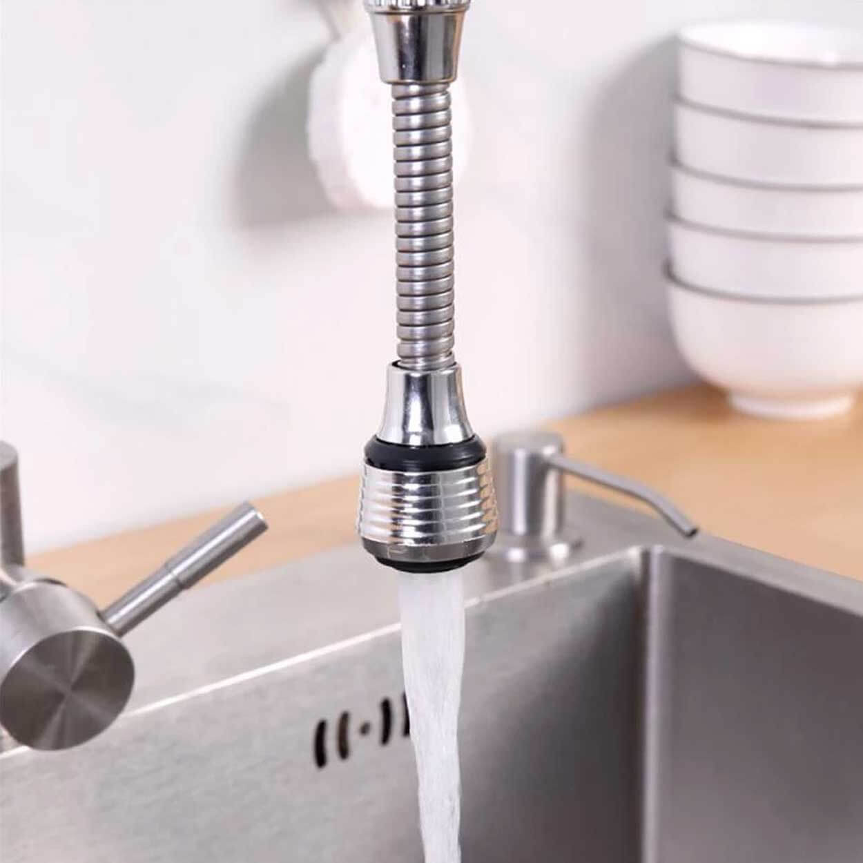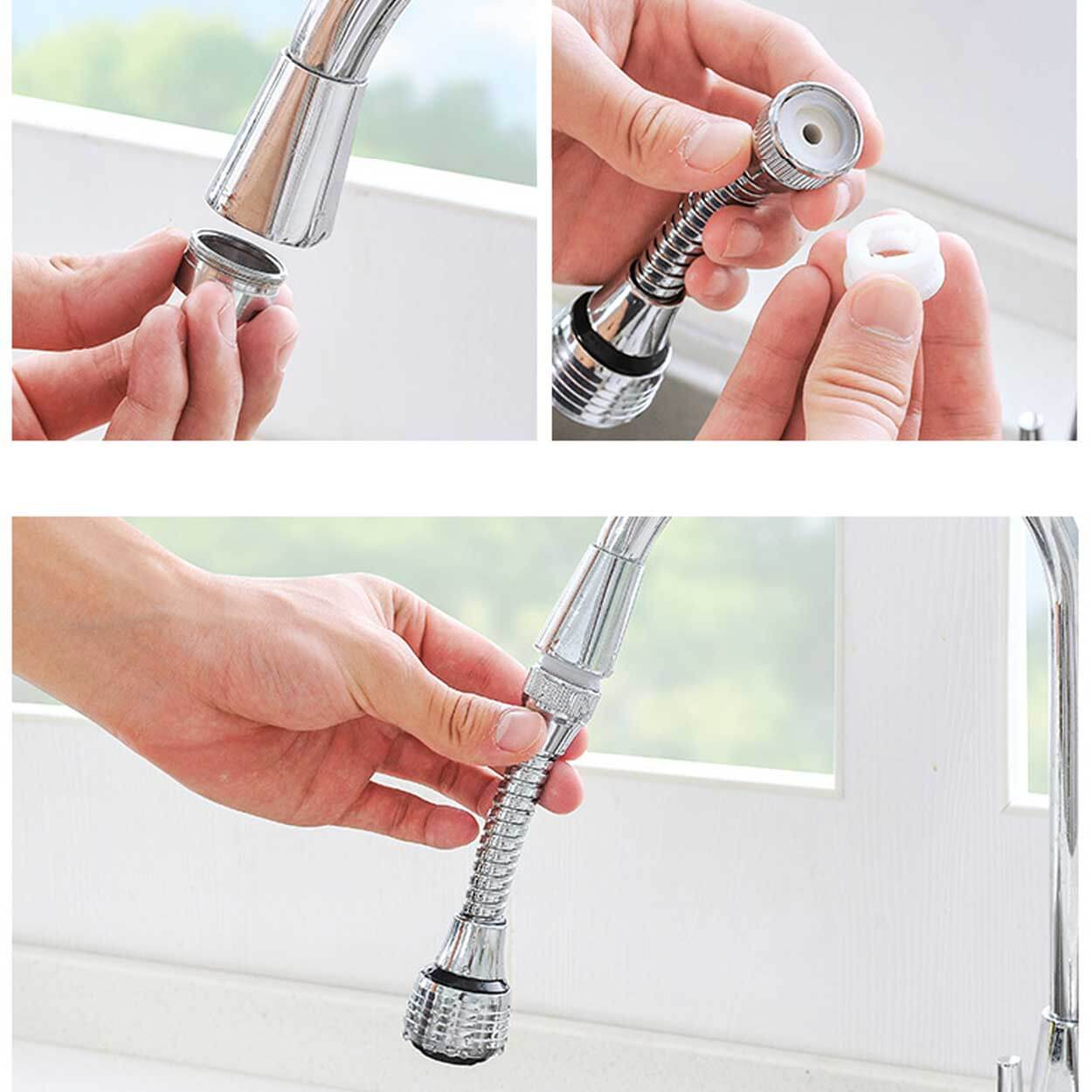 Roterbart kranmunstycke som monteras på befintlig kökskran för bättre kontroll över vattenstrålen. Munstycket kan vridas 360° för att nå hela diskhon och underlätta sköljning av disk, grönsaker och hörn som annars är svåra att komma åt. Växla mellan två strållägen: vanlig stråle för riktad sköljning och duschläge för bredare spridning. Den vattenbesparande funktionen hjälper till att minska vattenflödet vid daglig användning utan att försämra räckvidden.