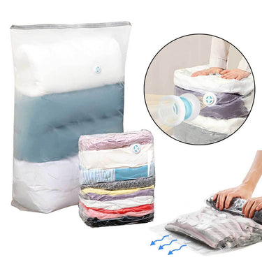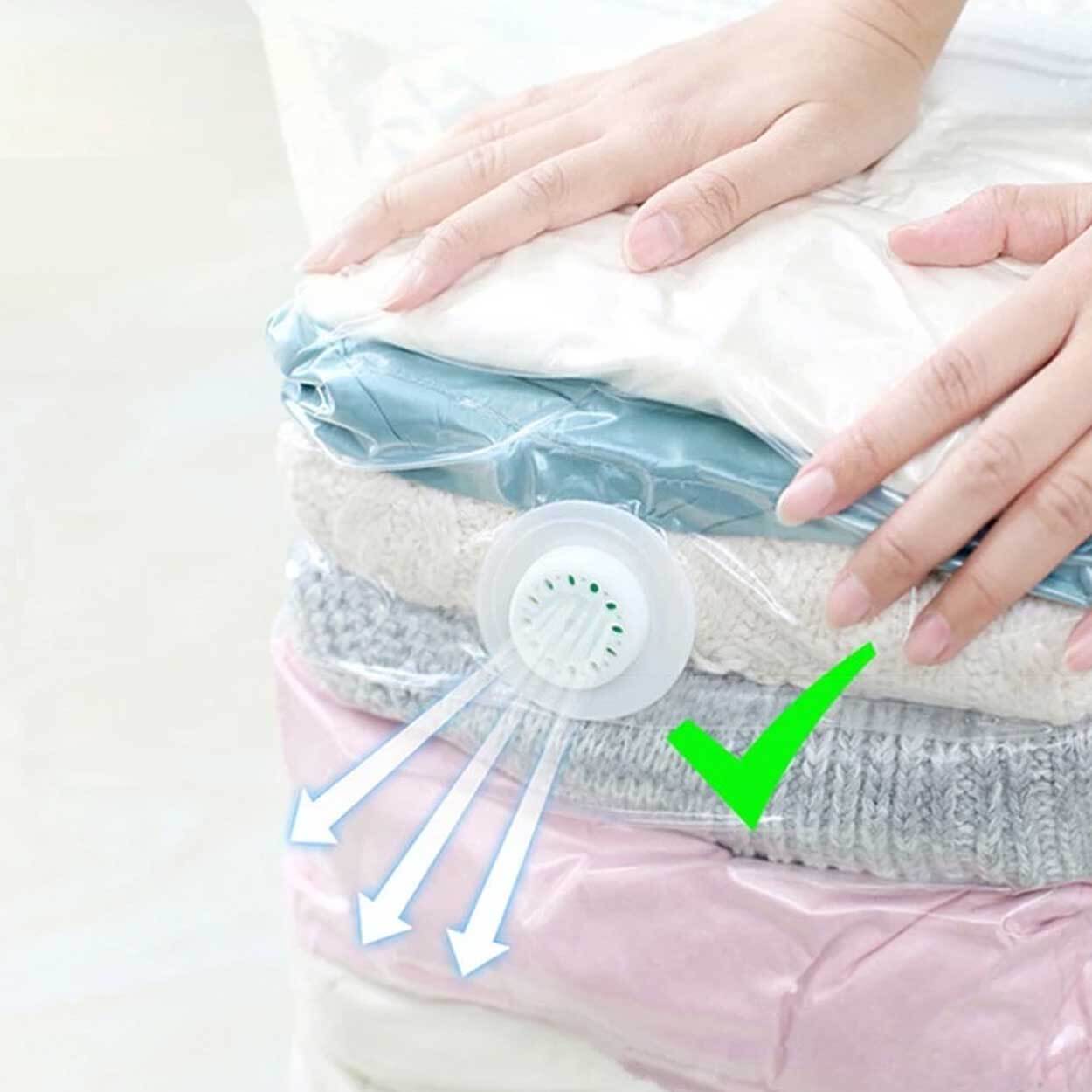 Vakuumpåse för platsbesparande förvaring av textilier som kläder, lakan, handdukar, kuddar och täcken. Påsen komprimerar innehållet genom att luften pressas ut, vilket minskar volymen och gör det enklare att få ordning i garderob, förråd eller under säng. Användningen är enkel: lägg i textilierna, förslut påsen och pressa ut luften tills önskad komprimering uppnås. Resultatet blir mer utrymme och en mer överskådlig förvaring av säsongsplagg och större textilier.