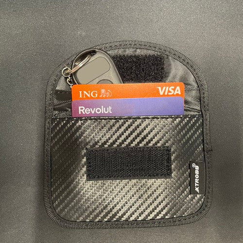 Anti-stöldfodral för bilnycklar och betalkort som hjälper till att blockera radiosignaler och minska risken för så kallade relay attack-stölder. Fodralet används genom att lägga bilnyckeln eller korten i respektive ficka och stänga med kardborrelåset, så att signaler inte kan läsas av utifrån. Ytterhöljet i PU ger tålig vardagsanvändning, medan polyesterfodrad insida skyddar innehållet. Passar för dig som vill ha ett enkelt, portabelt radioskydd i ficka eller väska.