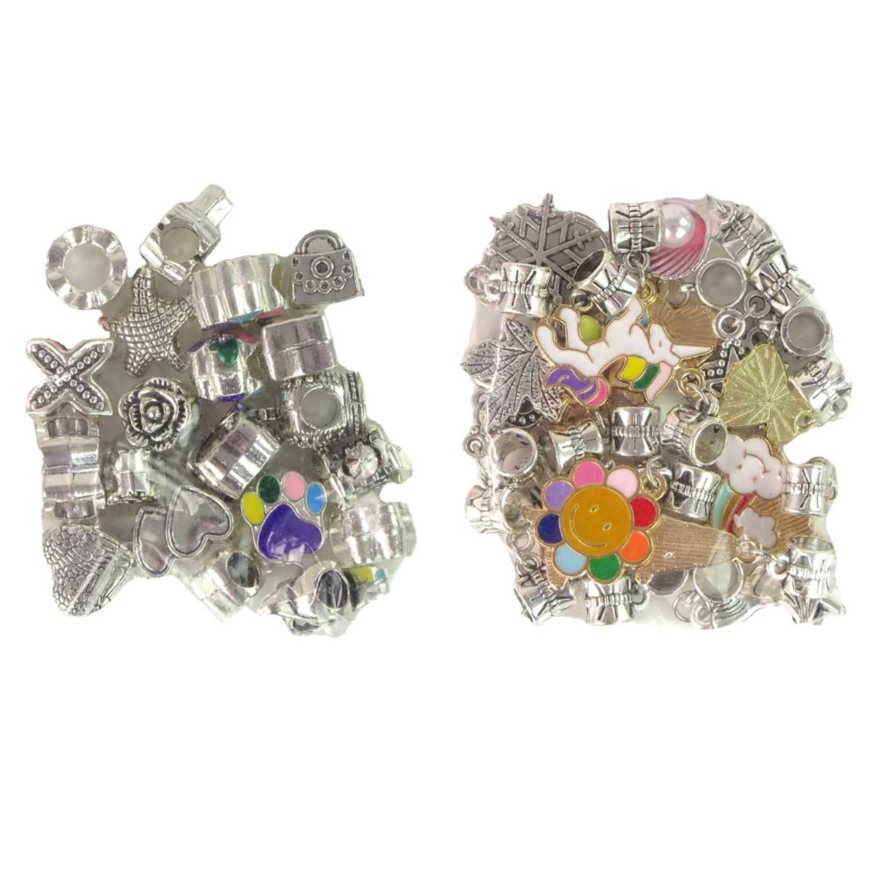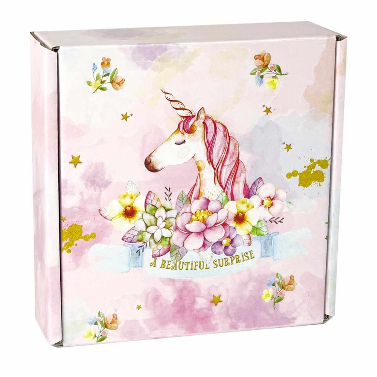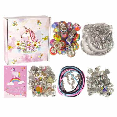 DIY armbandskit med enhörningstema som låter barn skapa egna smycken med berlocker och hängen. Setet innehåller instruktioner, metallhängen, runda berlocker, metallberlocker, 3 armband och 9 trådar, så det är enkelt att variera uttryck och bygga flera kombinationer. Pysslet tränar finmotorik och hjälper barnet att öva på att välja former och sätta ihop delar. Produkten är avsedd för barn från 3 år på grund av små delar och uppfyller EN71-standard för leksakssäkerhet.