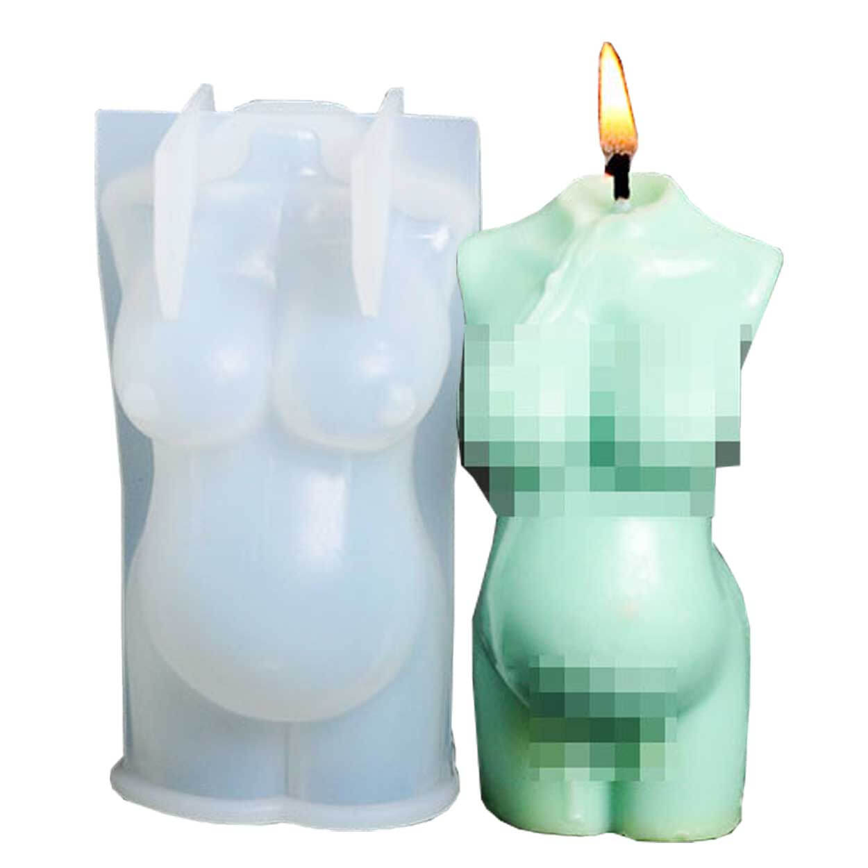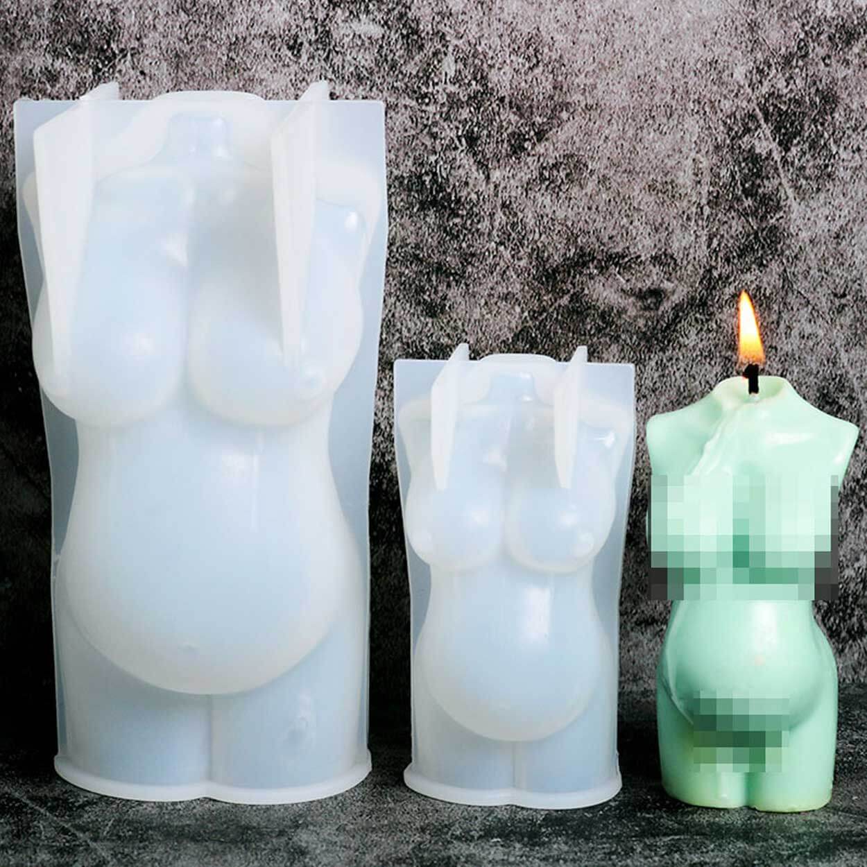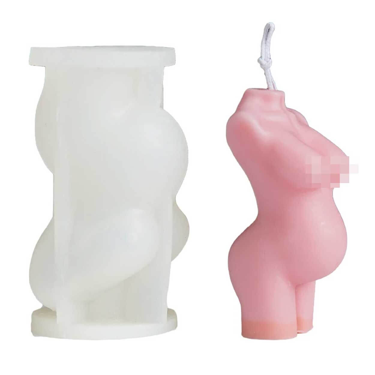 Silikonform för gjutning av stearinljus i 3D-motiv av en gravid kvinnokropp. Formen fungerar även för tvål, betong, choklad och enklare bakverk tack vare livsmedelsklassad silikon. Den flexibla konstruktionen gör det lätt att lossa det färdiga föremålet utan att det går sönder. Formen är återanvändbar och kan diskas i maskin för snabb rengöring. Temperaturtålighet från -60 till +240 °C gör den användbar både i frys och ugn, beroende på materialet som gjuts.