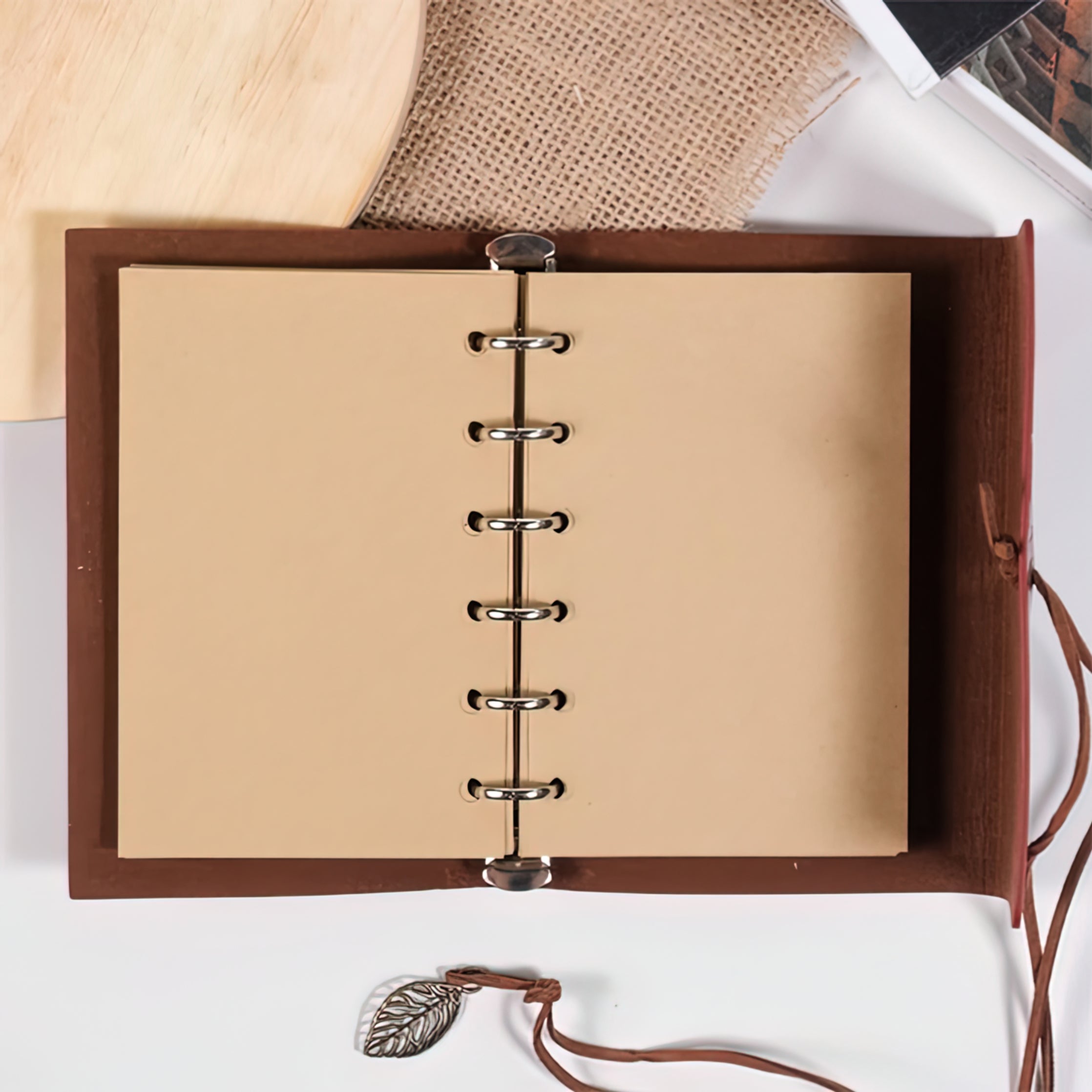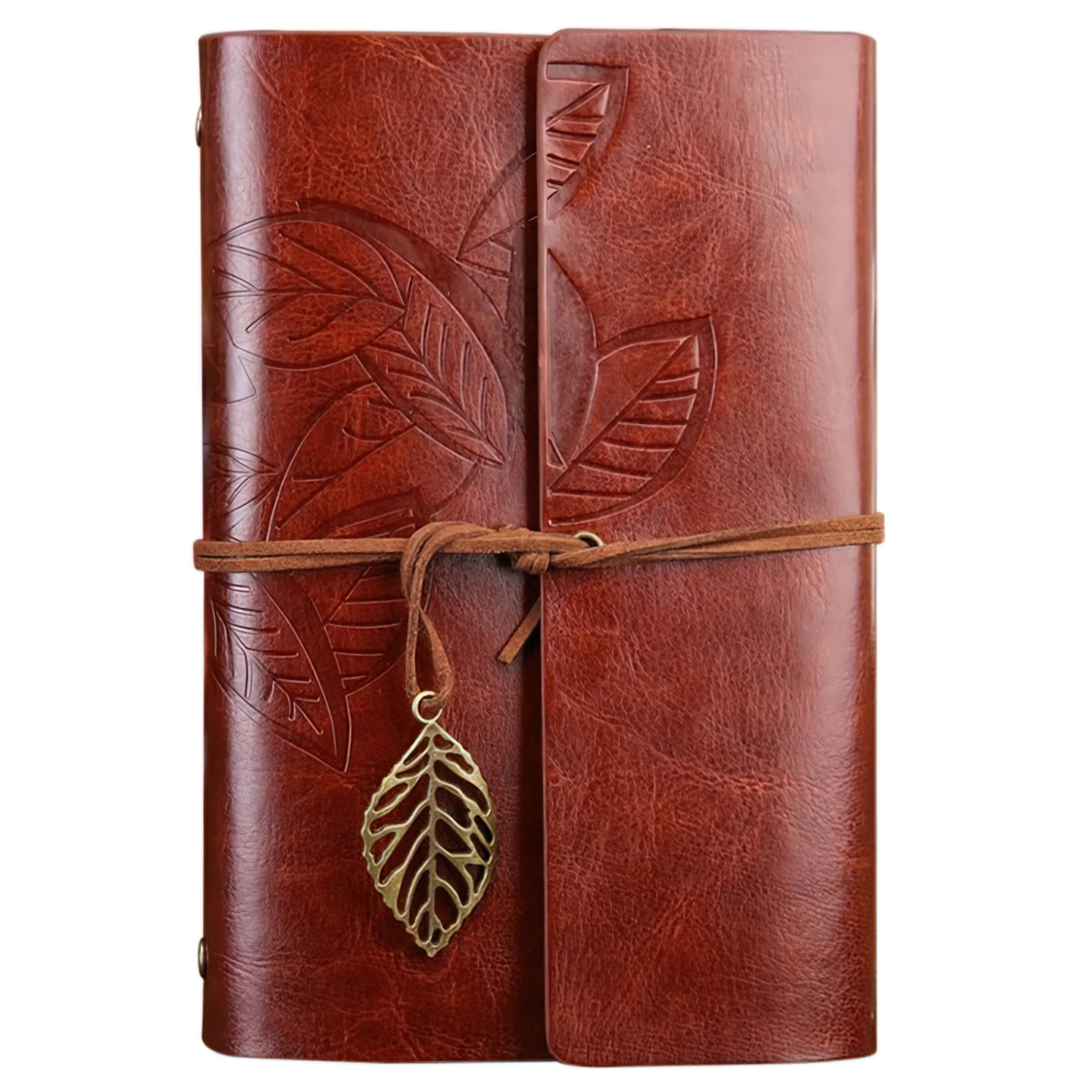 Retroinspirerad anteckningsbok som fungerar lika bra som dagbok, resejournal eller för vardagsanteckningar. Omslaget i konstläder ger en tålig yta som passar i både väska och på skrivbord. Läderbandet håller boken stängd under transport och skyddar innehållet när den ligger bland andra saker. Det kompakta formatet gör den smidig att ta med, så idéer, listor och viktiga noteringar kan skrivas ned direkt när de dyker upp.