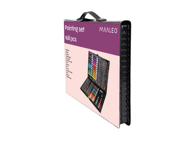 Målarset i väska med 168 delar som ger en bred bas för ritning och målning hemma, i skolan eller på kurs. Innehållet kombinerar 24 färgpennor för konturer, 24 tuschpennor för tydliga färgfält, 48 oljepasteller och 48 vaxkritor för mjukare uttryck samt 12 vattenfärger för flytande övergångar. Väskan har separata fack som håller materialet på plats och gör det enkelt att hitta rätt verktyg. Setet innehåller även pensel, palett, sudd, vässare, lim, korrigeringspenna och 5 ark papper.