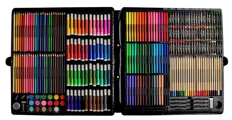 Målarset med 288 delar som ger ett brett urval för teckning, färgläggning och pyssel. Setet levereras i en praktisk plastväska som håller innehållet samlat och gör det enkelt att ta med mellan hem, skola och aktiviteter. Den organiserade uppdelningen i väskan ger snabb överblick och gör det smidigt att byta mellan olika verktyg under arbetet. Passar för kreativa projekt där många färger och uttryck behövs, från enklare skisser till mer detaljerade bilder.