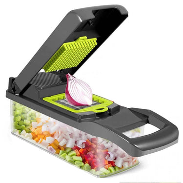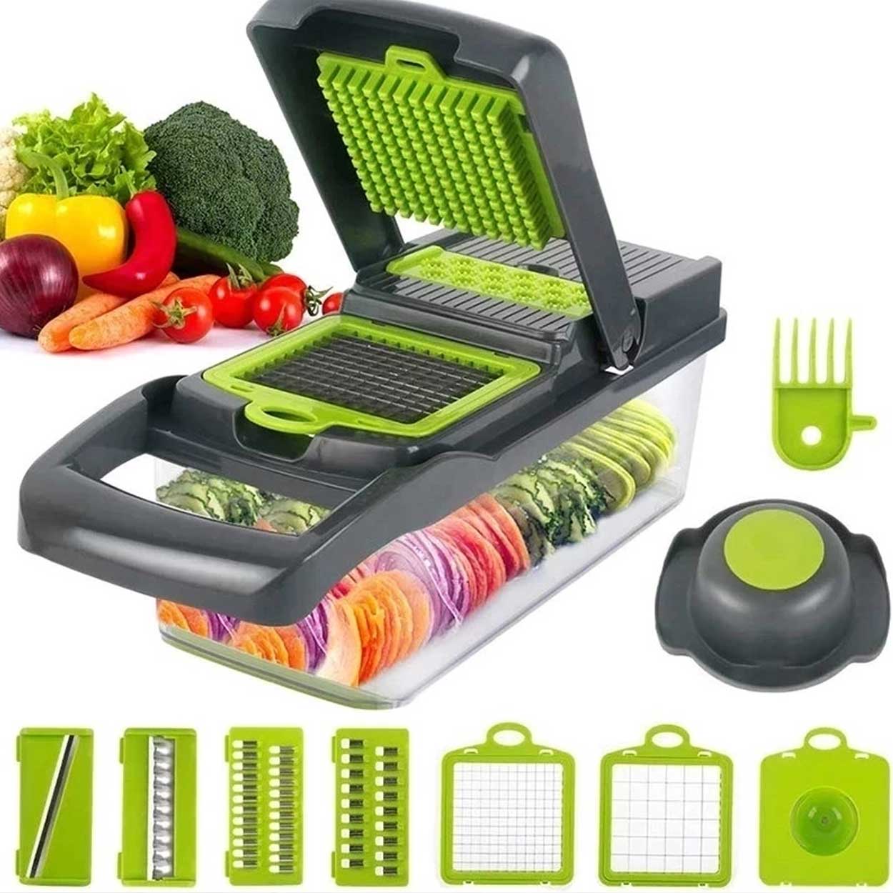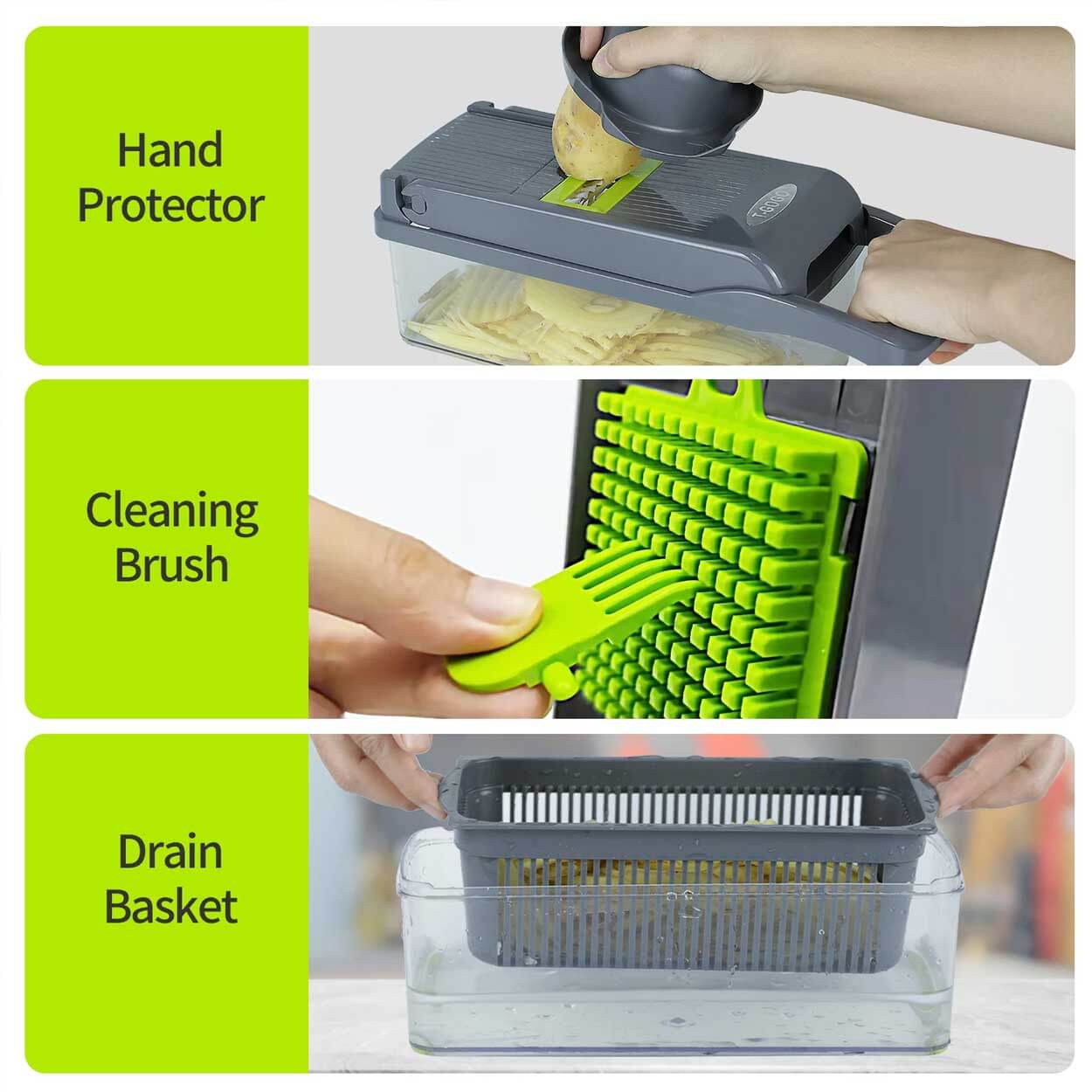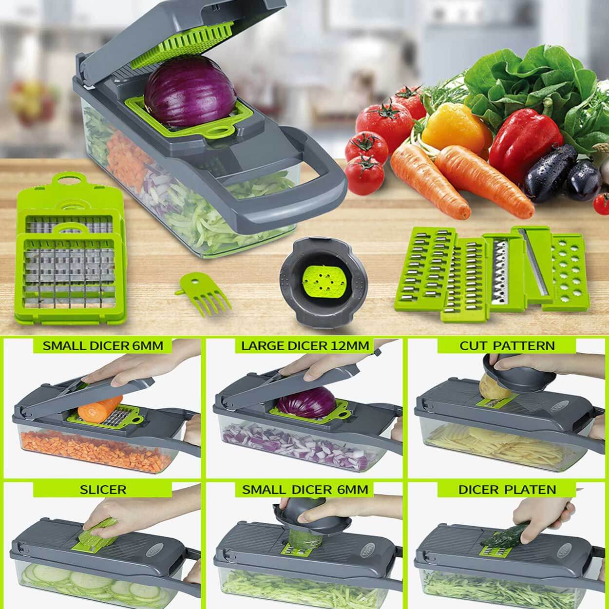 Grönsakshackare 14-i-1 som gör det enkelt att skiva, strimla och tärna frukt och grönsaker snabbt och jämnt. Utbytbara knivblad ger flera snitt, från tunna skivor till grova strimlor och tärningar. Bitarna hamnar direkt i uppsamlingsbehållaren, vilket minskar spill och håller arbetsytan renare. Setet innehåller även handskydd, handskalare, dräneringskorg och rengöringsverktyg för smidigare förberedelser och enklare rengöring. Passar för vardagsmat, matlådor och storkok.
