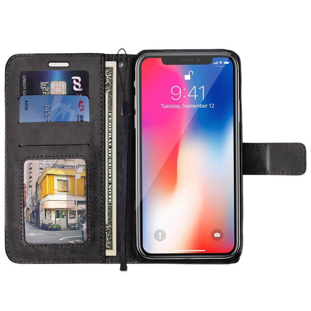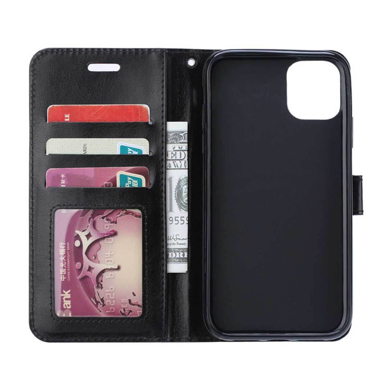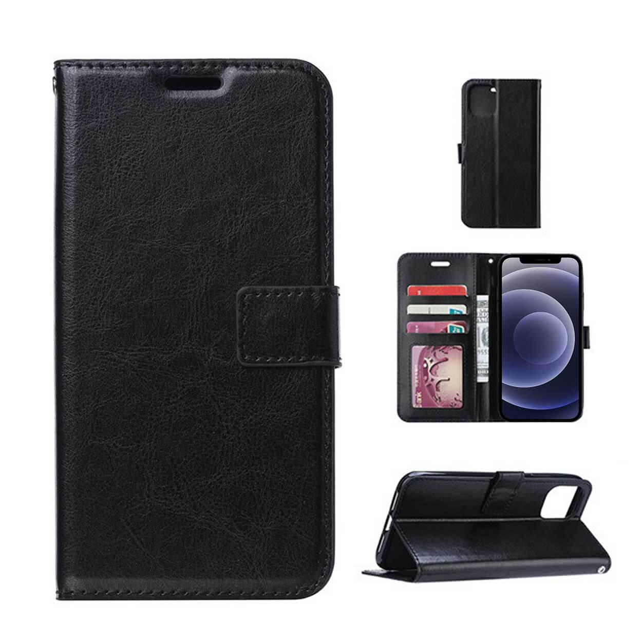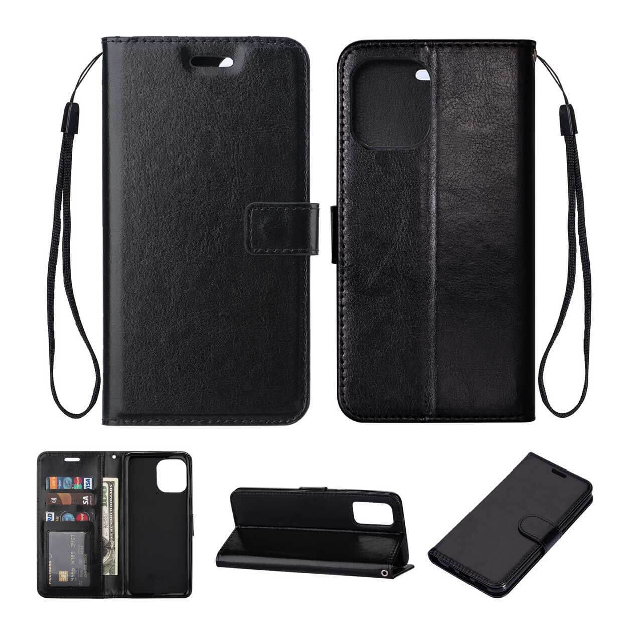 Plånboksfodral för iPhone 13 Pro Max som ger heltäckande skydd runt telefonen och skyddar även skärmen när fodralet är stängt. Utskärningar finns för kamera, laddning, knappar och högtalare så att mobilen kan användas utan att ta ur den. Insidan har tre kortfack samt ett separat fack för sedlar eller kvitton, och ett av facken har ett genomskinligt ID-fönster. Fodralet stängs med magnetlås, kan vikas till ett ställ för visning och levereras med handledsrem. Tillverkat i PU-läder med innerskal i TPU.