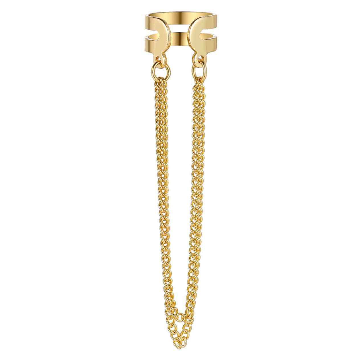 Ear cuff med kedja som ger en piercingliknande effekt utan håltagning. Smycket fästs med ett klämgrepp runt örat och kan tas av och på vid behov, vilket gör det enkelt att variera uttryck. Den hängande kedjan skapar rörelse och en tydlig detalj som fungerar både ensam och ihop med andra örhängen. Guldpläterad yta ger en klassisk smyckeston och passar när du vill testa en mer markerad stil utan permanent förändring.