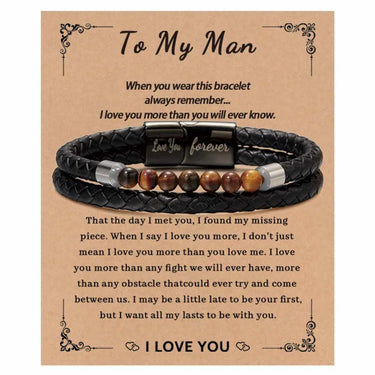 Herrarmband i tvåradig konstruktion som kombinerar PU-läder med tigeröga pärlor för en tydlig, maskulin känsla. Spännet har en graverad text som gör smycket personligt och lätt att ge bort. Ett tryckt gåvokort med en färdig hälsning ingår, vilket gör presenten enkel att överlämna vid födelsedag, årsdag eller som en spontan uppskattning. Armbandet levereras i en presentklar låda som skyddar smycket och ger ett prydligt intryck direkt vid öppning.