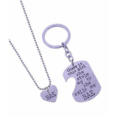 Tvådelat set som kombinerar halsband och nyckelring för parmatchning. Ena delen bärs som halsband med 50 cm kedja och den andra används som nyckelring, så att två personer kan ha varsin matchande del. Tillverkat i rostfritt stål för tålig användning i vardagen. Hänget har ett kompakt format på 1,8 x 1,7 cm och nyckelringen mäter 9,8 x 3 cm, vilket gör den enkel att hantera och lätt att hitta bland nycklar.