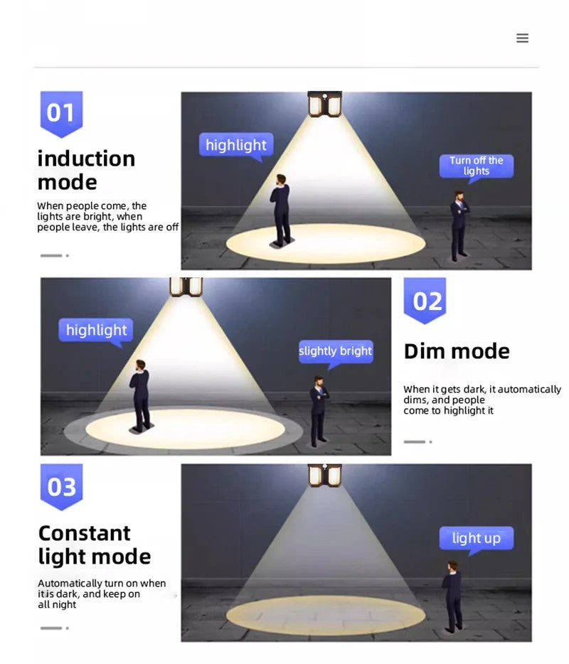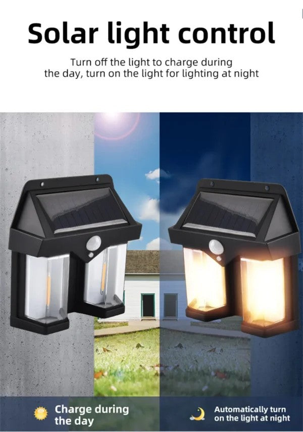 Dubbel LED-ljusbild Skymningssensor Rörelsesensor Tre ljuslägen Solcellsladdning