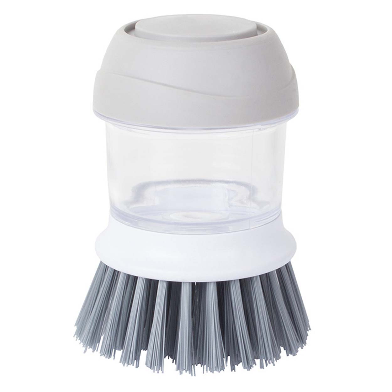 Diskborste med inbyggd diskmedelsdispenser som gör diskningen snabbare och mer kontrollerad. Diskmedel doseras direkt i borsten via en tryckknapp, vilket minskar behovet av att hantera diskmedelsflaskan under arbetet. Den runda borstytan passar bra för att skrubba grytor, kastruller och andra ytor som kräver lite extra kraft. Medföljande ställ har avrinning som samlar upp dropp och hjälper till att hålla diskbänken torrare mellan användningarna.