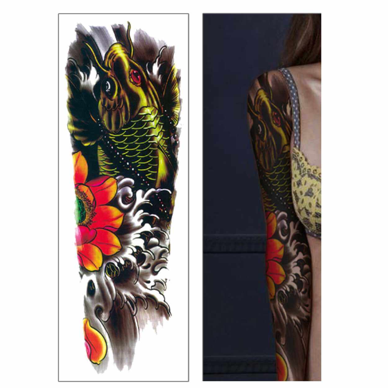 Fake tattoo sleeve med koi-motiv som appliceras som en gnuggis direkt på huden. Placera motivsidan nedåt mot huden och fukta ordentligt med svamp eller handduk. Vänta minst 30 sekunder innan pappret dras bort försiktigt och låt sedan tatueringen lufttorka. För att ta bort, dutta med hudvänlig alkohol eller babyolja, vänta cirka 10 sekunder och gnid försiktigt. Upprepa vid behov tills tatueringen är helt borta.