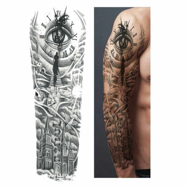 Tillfällig tattoo sleeve med klockmotiv som ger intryck av en hel arm-tatuering utan permanent resultat. Applicera på ren, torr hud genom att lägga motivsidan mot huden och fukta ordentligt med svamp eller handduk. Vänta minst 30 sekunder, dra sedan bort pappret och låt tatueringen lufttorka. För borttagning används babyolja eller hudvänlig alkohol. Dutta, vänta cirka 10 sekunder och gnid försiktigt tills motivet släpper. Passar för event, kostym och för att prova en sleeve-look.