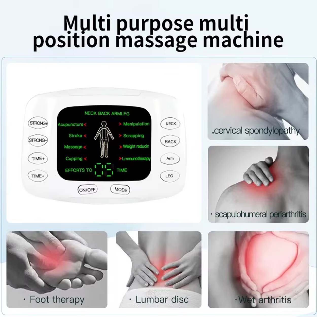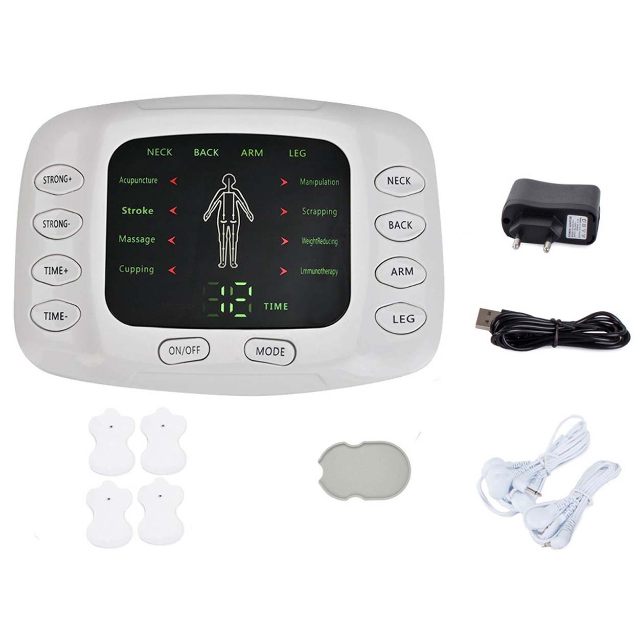 EMS/TENS-muskelstimulator för muskelstimulering och smärtlindring i vardagen. Enheten låter dig välja mellan 8 program och justera intensiteten i 15 nivåer för att anpassa behandlingen efter känsla och behov. Elektroderna fästs på valda muskelgrupper, exempelvis nacke, rygg, armar eller ben, och systemet kan användas med upp till fyra elektroder samtidigt. Drift sker antingen med AA-batterier eller via USB-strömkabel, vilket gör den enkel att använda både hemma och på resa.