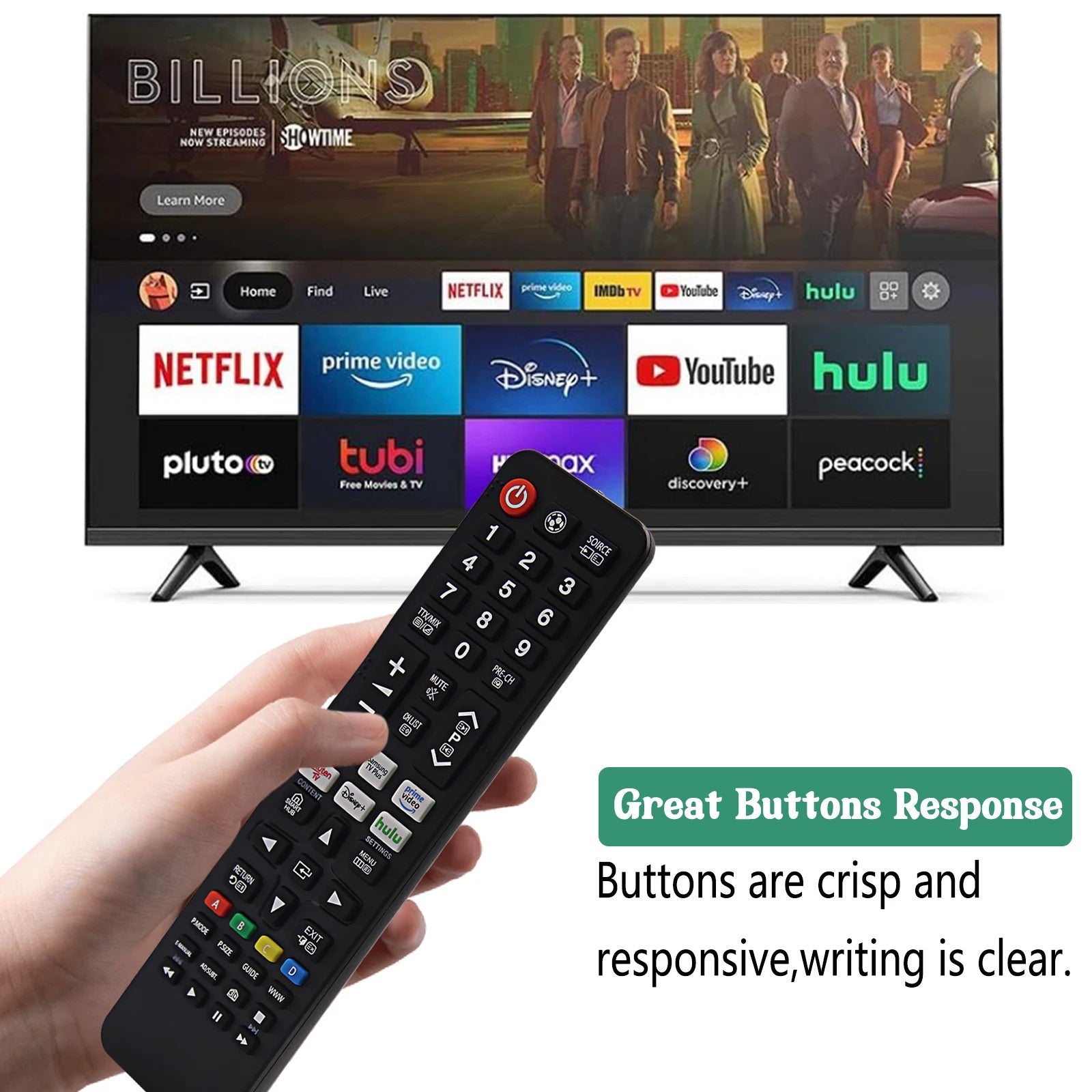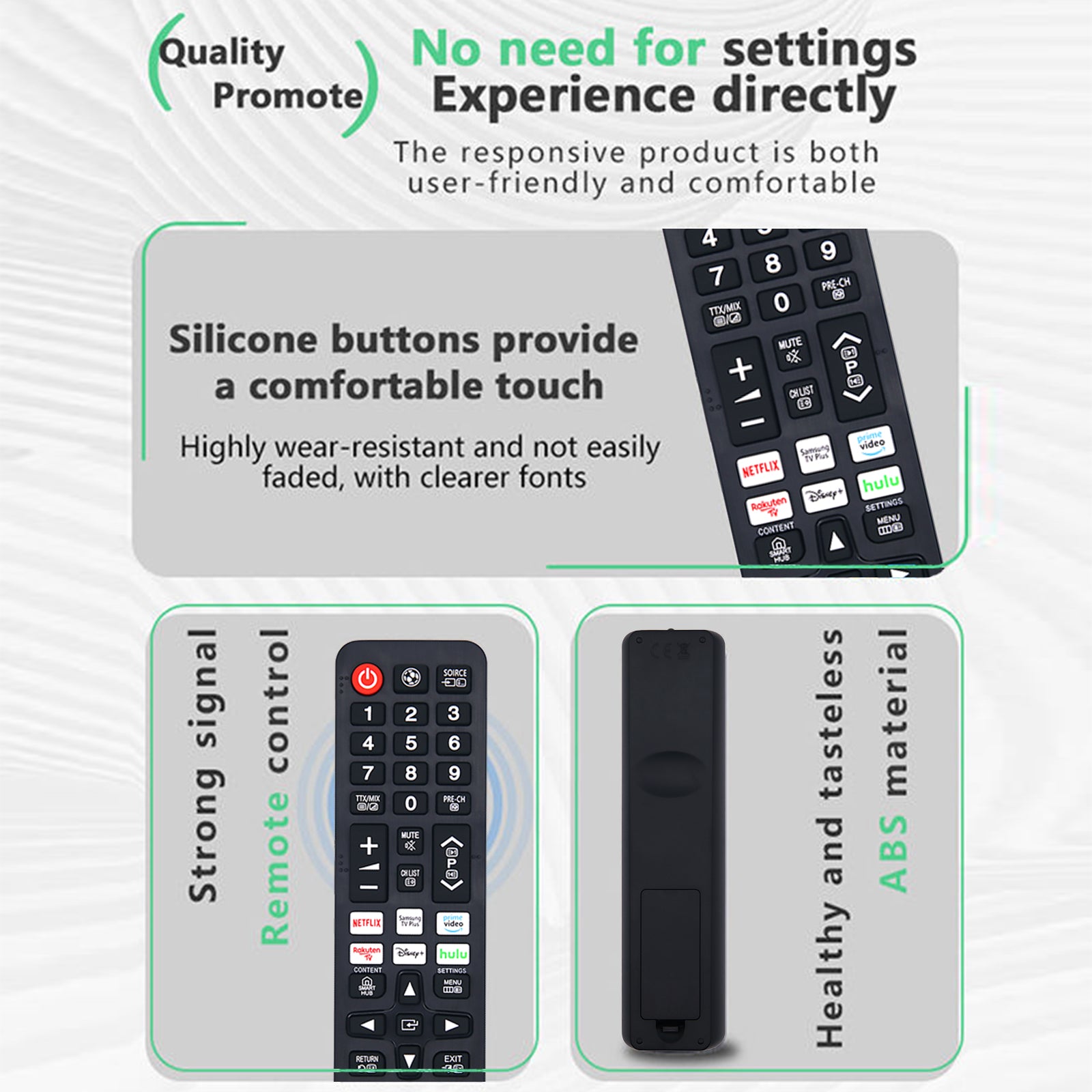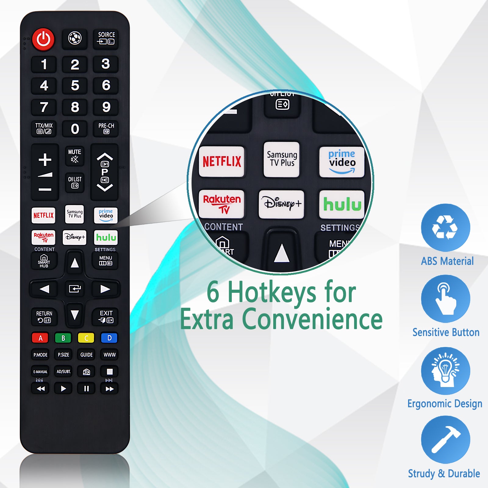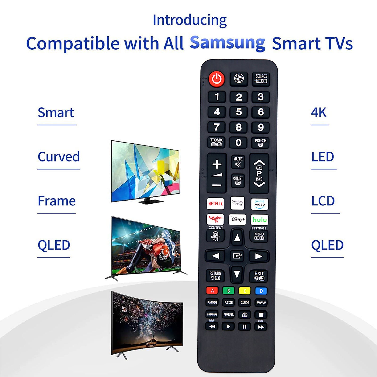 Universell TV-fjärrkontroll kompatibel med Samsung TV, inklusive Smart TV samt LED, UHD och QLED. Direktstart utan krångliga inställningar i normalfallet. Sätt i 2 AAA-batterier och börja använda. IR-tekniken ger stabil räckvidd och snabb respons vid kanalbyte, volym och menyval. Konstruktionen i ABS-plast kombineras med silikonknappar för tydlig knappkänsla och bra hållbarhet i vardagen. Passar som ersättare när originalet saknas eller som extra fjärrkontroll i hem, kontor eller hotell.
