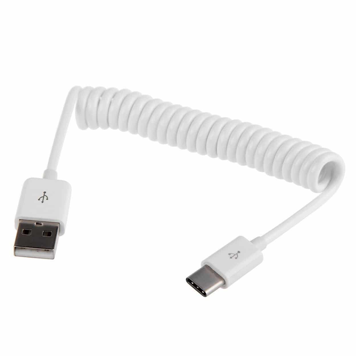 USB-C spiralkabel för laddning och dataöverföring mellan USB och USB-C. Spiralkonstruktionen håller kabeln kort och lätt att hantera när den inte används, men kan dras ut vid behov för bättre räckvidd. Stöd finns för Quick Charge 2.0 och 3.0 när både laddare och enhet är kompatibla. Passar många telefoner och tillbehör med USB-C, inklusive flera vanliga Android-modeller. Ett praktiskt val för skrivbord, bil eller resväska där du vill minska kabeltrassel.