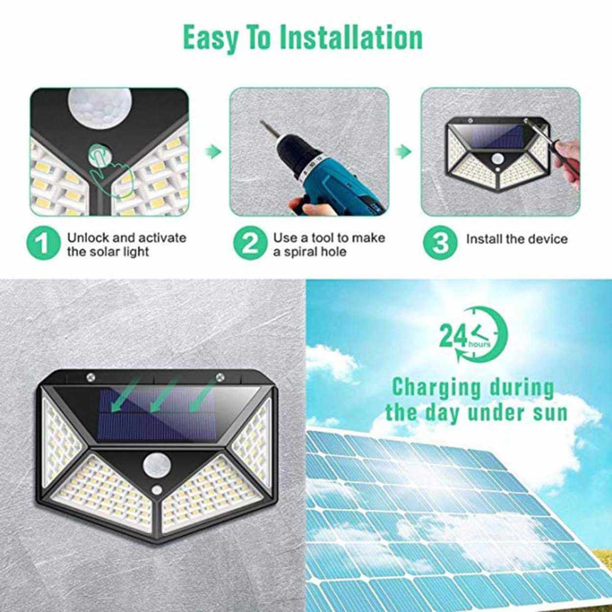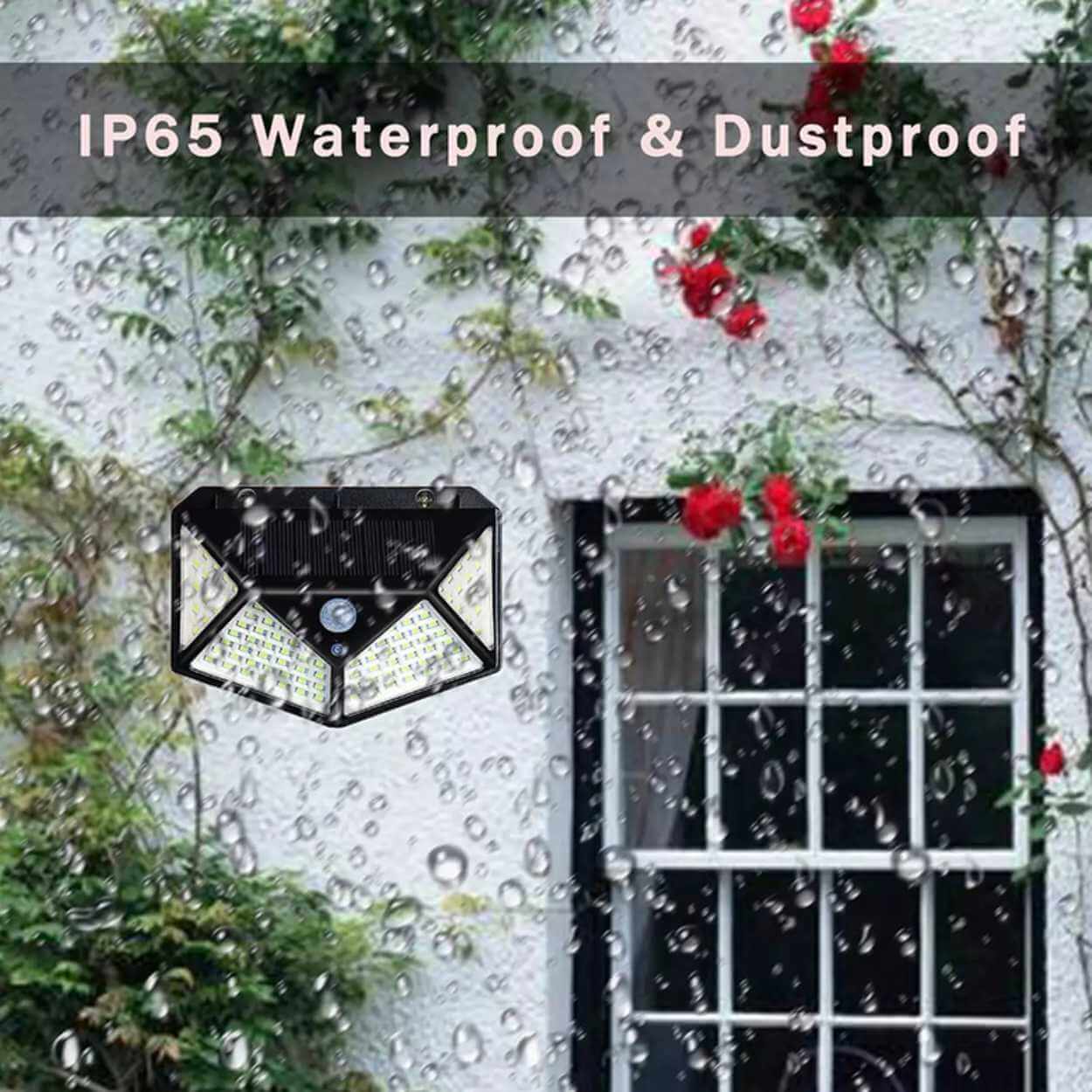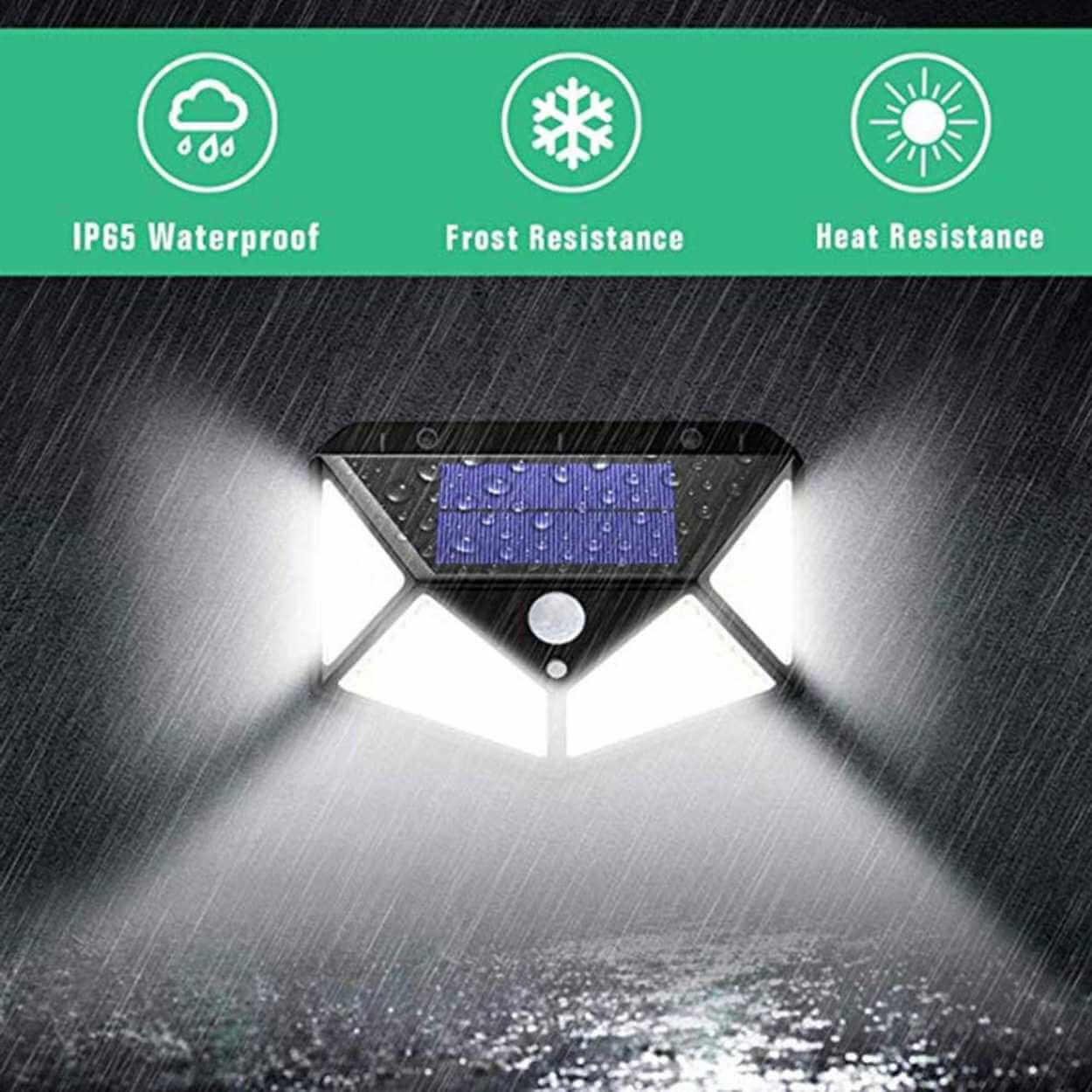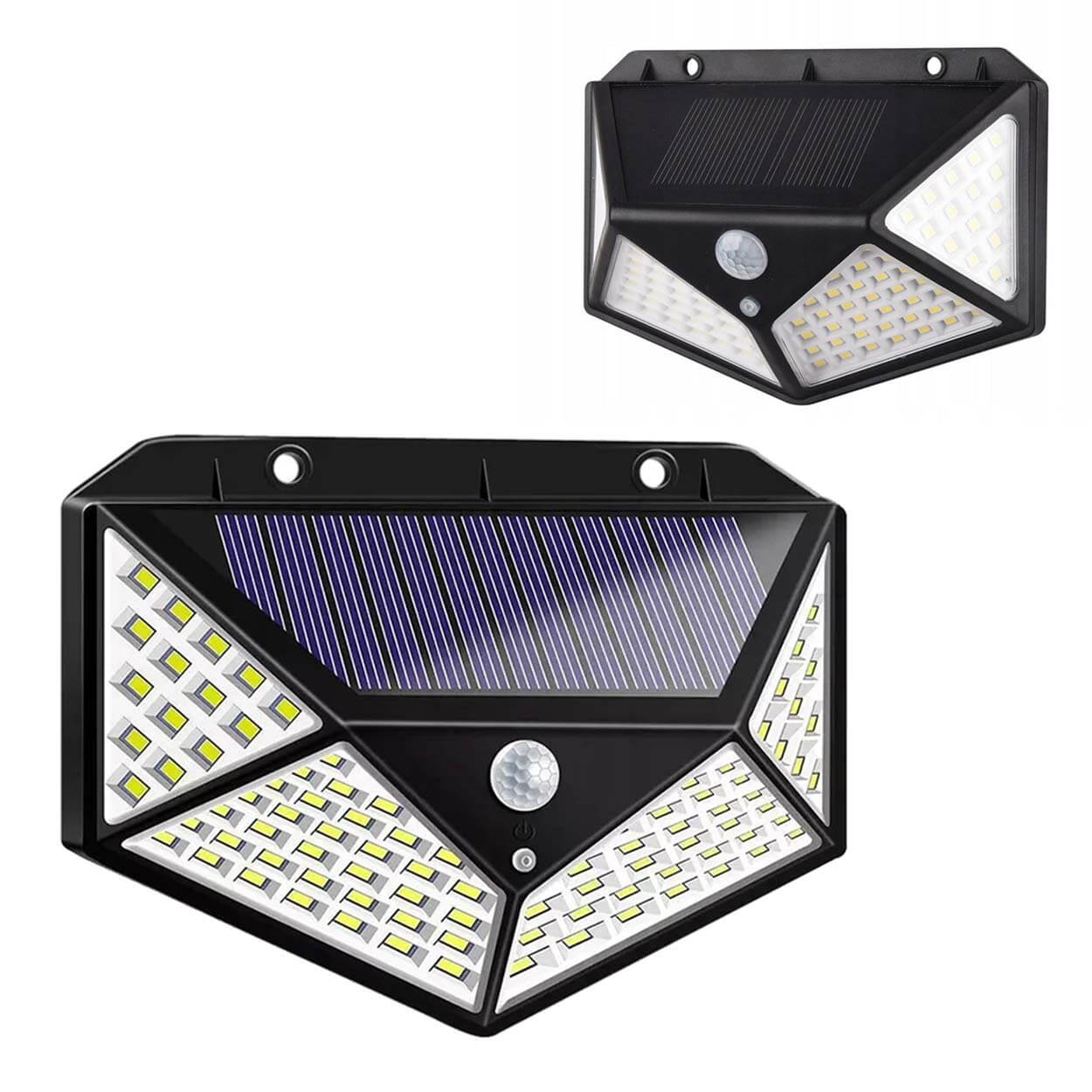 Solcellsvägglampa / utomhuslampa – rörelsesensor, 3 lägen – IP65, 100 LED, 18650