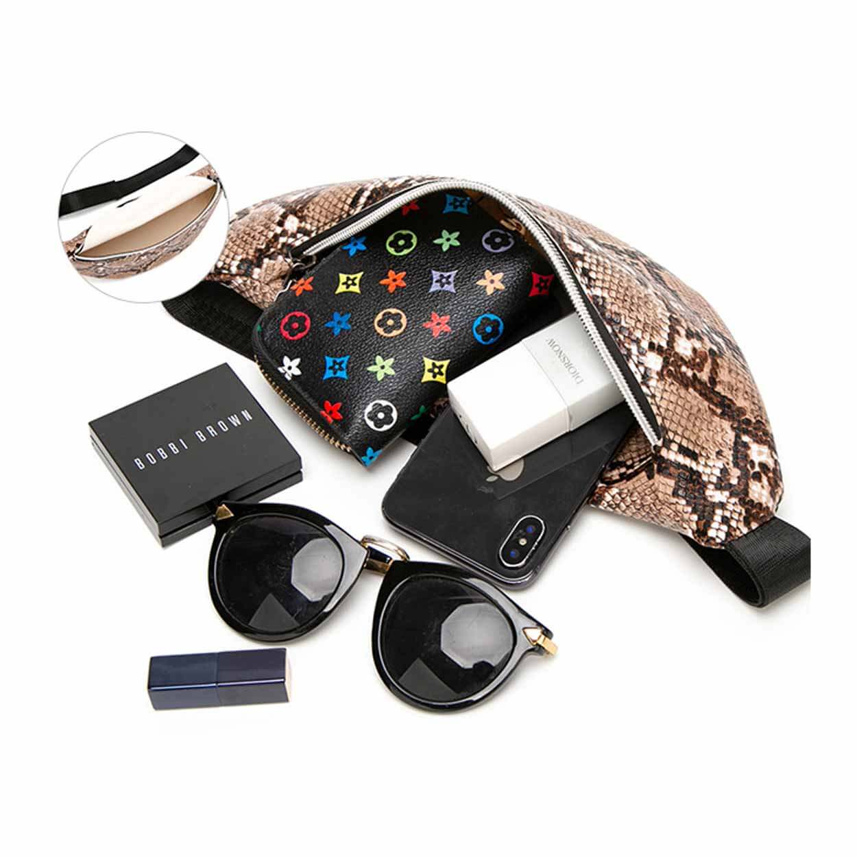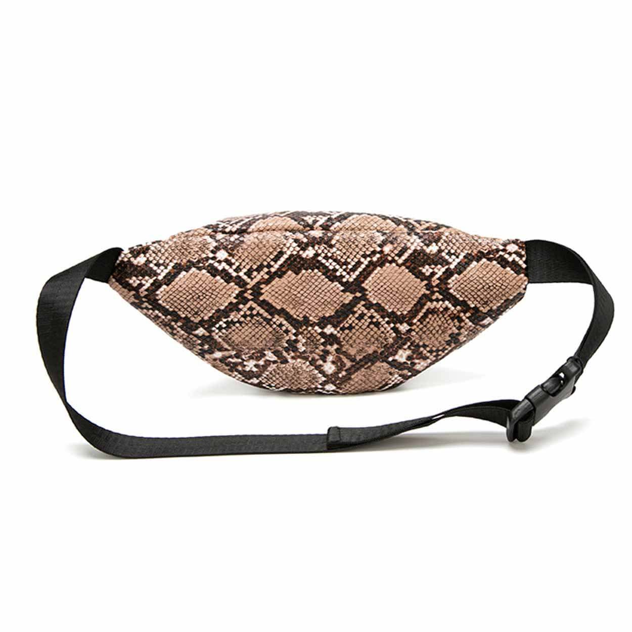 Ormskinnsmönstrad midjeväska som ger smidig förvaring när du vill ha händerna fria. Huvudfacket stängs med dragkedja och rymmer vardagsprylar som mobiltelefon, nycklar, pass, plånbok och powerbank. Väskan kan bäras runt midjan eller som axelväska/crossbody beroende på situation och önskad passform. Låg vikt gör den enkel att ta med under hela dagen, både på resa och i stadsmiljö.