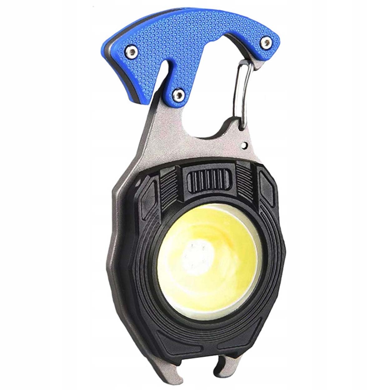 LED-nyckelring i multiverktygsformat som kombinerar ficklampa, elektrisk tändare och flera vardagsfunktioner i ett kompakt format. COB-ljuset ger vitt, gult och rött sken med flera lägen, inklusive varningssignal, för att passa både arbete och nödsituationer. Magnet på baksidan gör att lampan kan fästas på metallytor för handsfree-belysning. Karbinhaken gör den enkel att bära på nycklar eller väska. Verktygsdelen inkluderar flasköppnare, kniv, visselpipa samt Phillips- och spårmejsel. Laddas via USB-C.