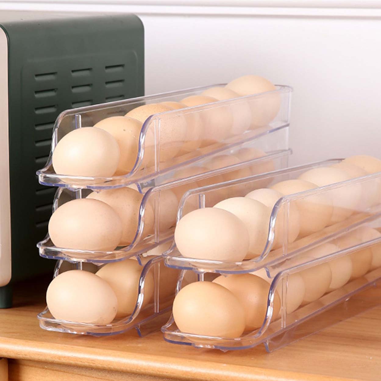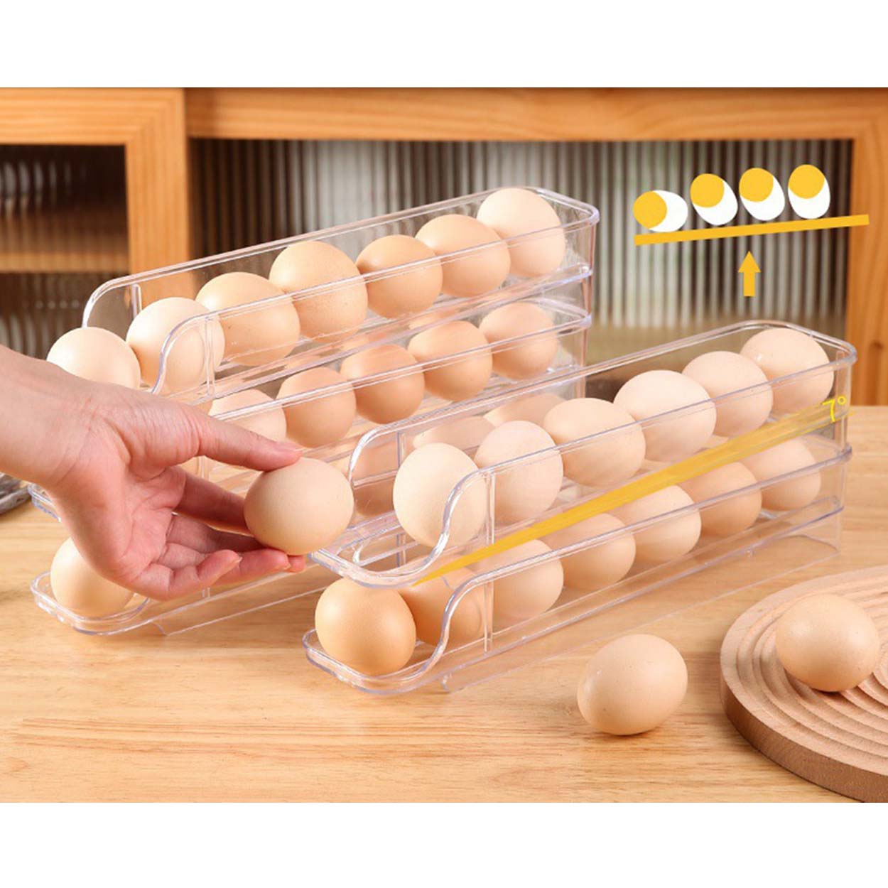Äggdispenser för kylskåp som håller äggen samlade och lättåtkomliga. Lådan rymmer upp till 14 ägg och använder en rullande matning där nästa ägg glider fram när ett tas ut. Det minskar risken för att ägg blir liggande löst i kylen och gör påfyllning enkel. Konstruktionen är gjord i transparent plast för snabb överblick av hur många ägg som finns kvar. Släta ytor gör den lätt att torka av vid behov och passar bra på en kylhylla.