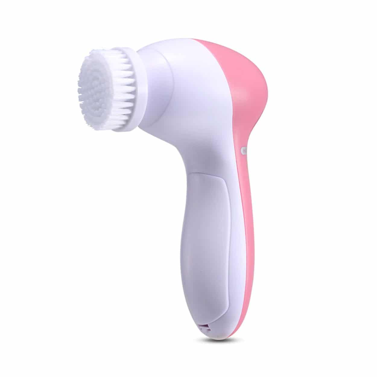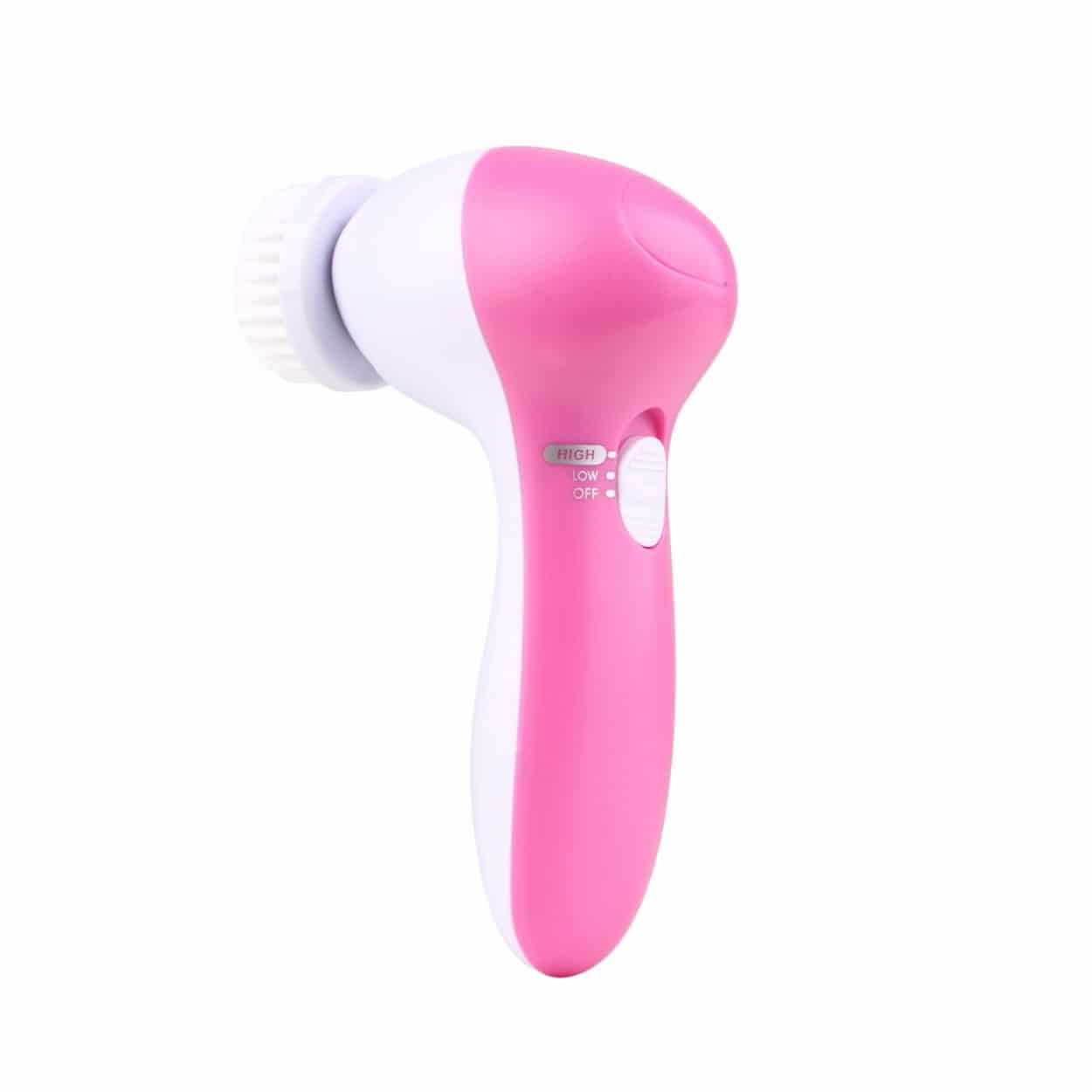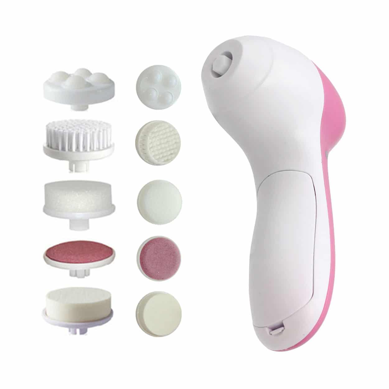 Elektrisk ansiktsborste 5-i-1 för rengöring, exfoliering och massage av hud. Handenheten används med utbytbara munstycken som anpassar funktionen efter behov, från djupare rengöring till skonsam tvätt och mjuk massage. Setet innehåller även ett sliphuvud med pimpsten för att fila bort förhårdnader på exempelvis fötter och armbågar. Borsten drivs av 2 AA-batterier, vilket gör den enkel att använda utan laddning. Passar för daglig hudvård och kan användas på både ansikte och kropp.