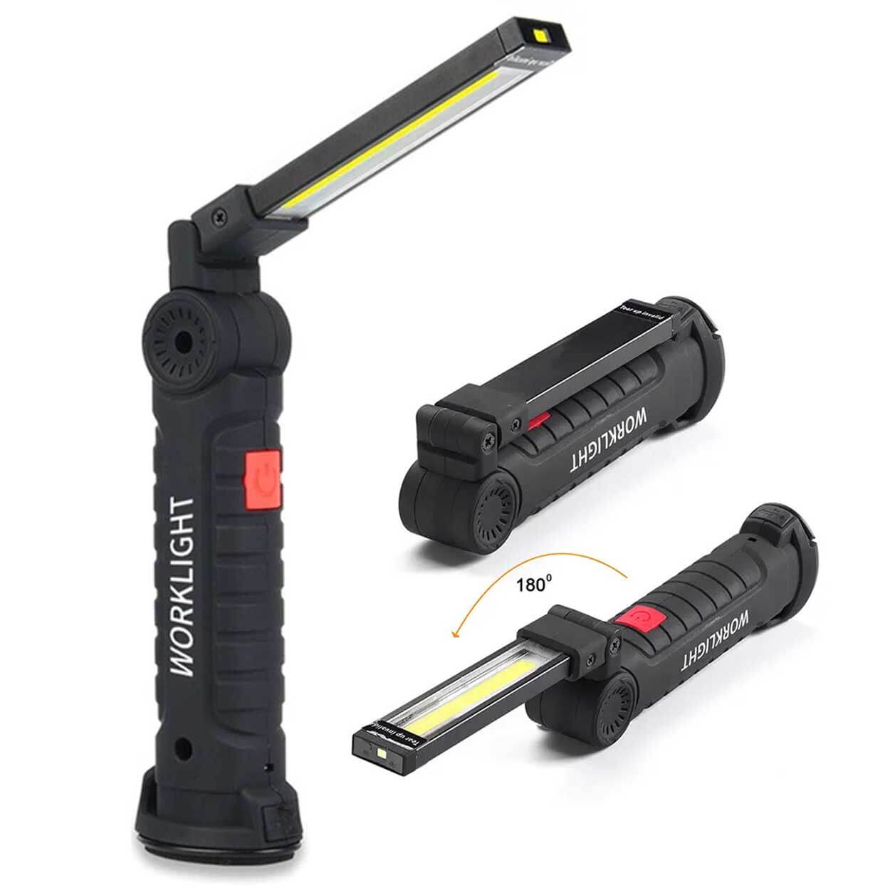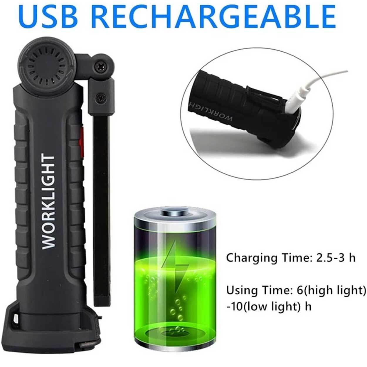 Uppladdningsbar LED-arbetslampa som ger kraftfullt arbetsljus när sikten är dålig, vid strömavbrott eller i verkstaden. COB-ljuskälla och 4 XPE-LED ger upp till 600 lumen och fem lägen: hög, låg, mini, röd samt röd SOS. Magnetfäste i botten gör att lampan kan fästas på metallytor för handsfree-belysning. Roterbart huvud med 360° rörelse ger flexibel riktning på ljuset. Drivs av ett 1200 mAh 18650 litiumbatteri och laddas via micro-USB, kabel ingår.