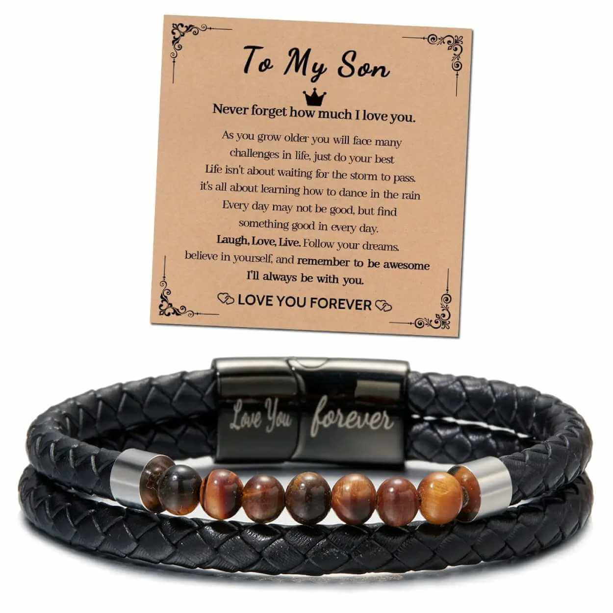 Gåvoarmband för son i tvåradig modell som kombinerar slitstarkt PU-läder med tigeröga-stenpärlor. Spännet är graverat med budskapet Love you forever och ger en personlig detalj som passar både till vardag och mer uppklädda tillfällen. Ett tryckt kort med en längre hälsning ingår och gör presenten tydlig utan att du behöver skriva eget. Armbandet levereras i en ask som är redo att ges bort vid födelsedag, examen eller när du vill ge en uppskattad påminnelse om er relation.