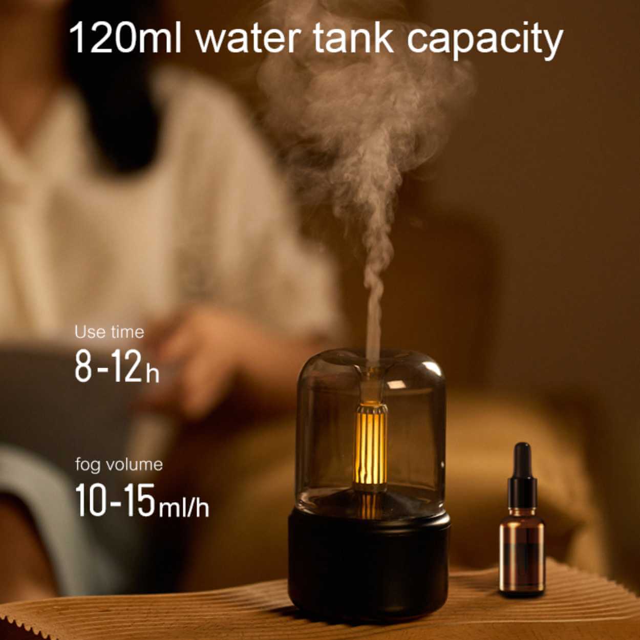 Aroma diffuser och luftfuktare som sprider doft och fin dimma för ett behagligare inomhusklimat. Vattentanken på 120 ml ger cirka 8–12 timmars drift och en sprayvolym på 10–15 ml per timme. Inbyggd belysning skapar ett mjukt stämningsljus med ljuseffekt som påminner om levande ljus. Enkel styrning via knapp: kort tryck startar dimfunktionen och långt tryck aktiverar nattljusläge. Automatisk avstängning ökar säkerheten när vattnet tar slut. USB Type-C kabel och bruksanvisning ingår.
