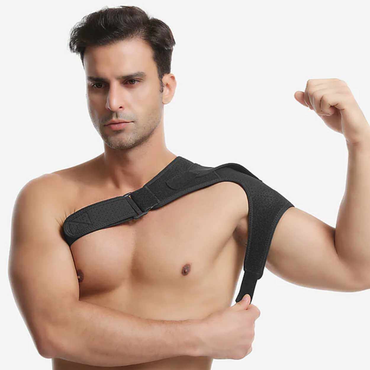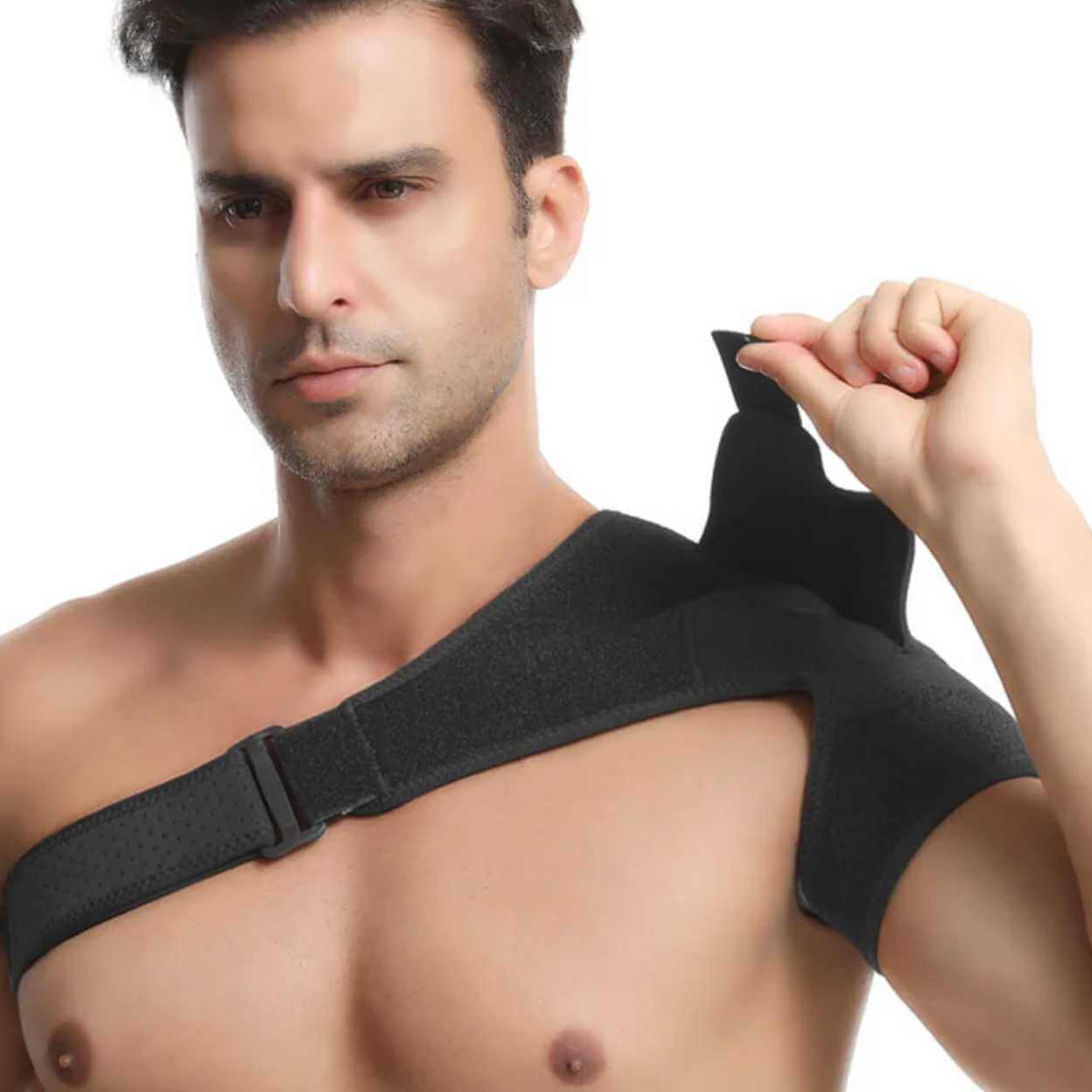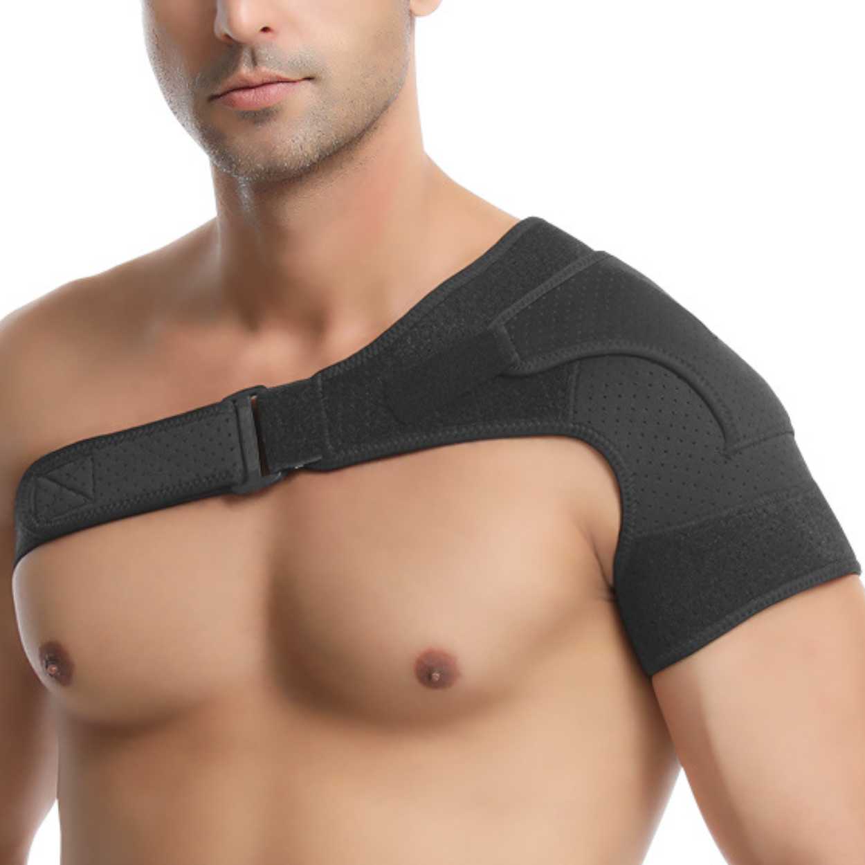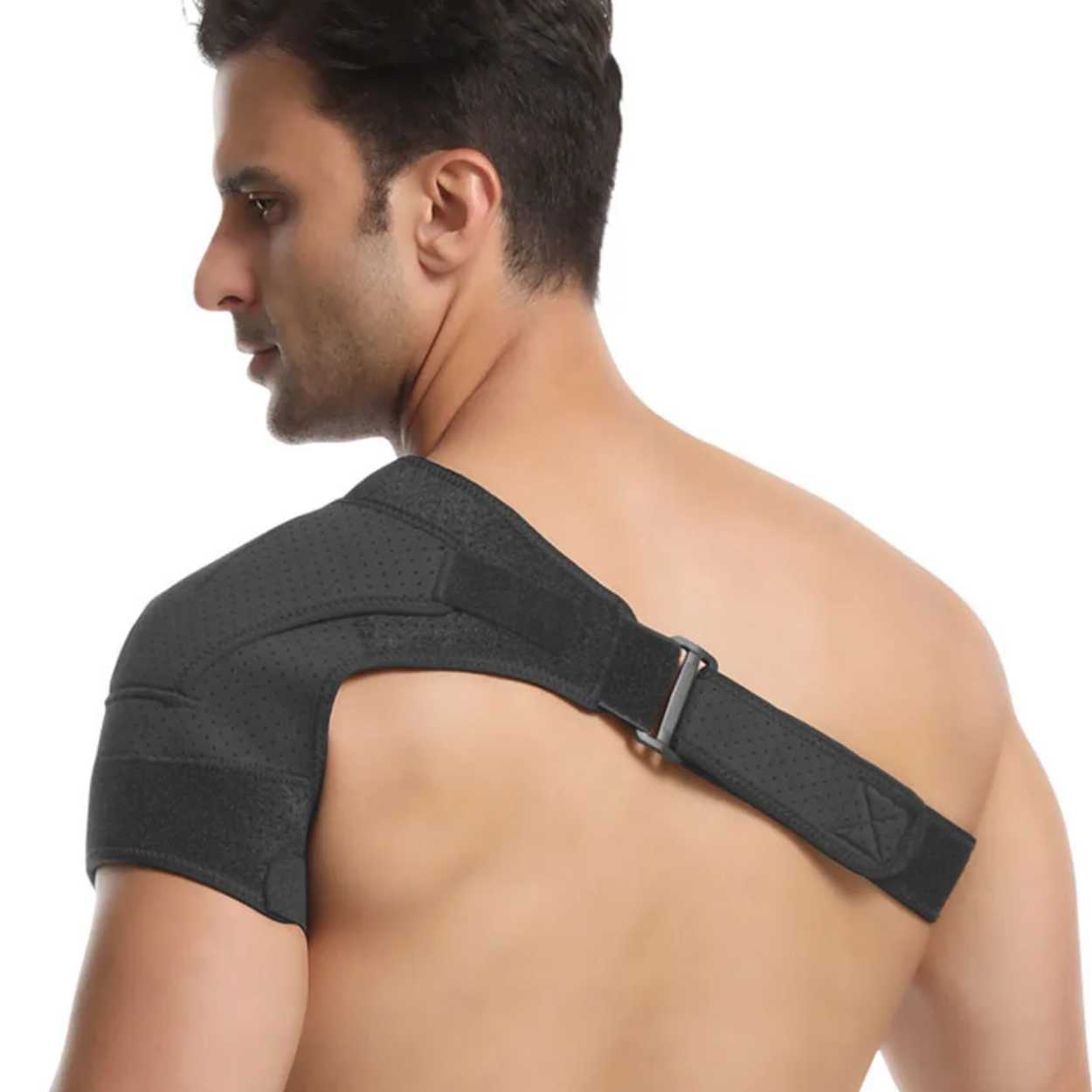 Justerbart axelstöd som ger stabilt stöd vid ömhet, sträckning och belastning. Konstruktionen passar både höger och vänster axel och justeras för att sitta säkert utan att begränsa rörligheten mer än nödvändigt. En inbyggd tryckdyna ger extra stöd över utvalda punkter, vilket kan vara hjälpsamt vid återhämtning och vid fysisk aktivitet. Material i nylon, SBR och OK-tyg ger en följsam känsla och god hållbarhet. Stödet tas enkelt på och av och fungerar för både träning och daglig användning.