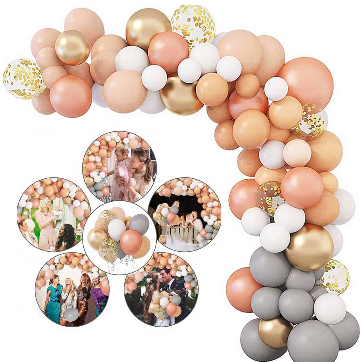 Ballongbåge set för att bygga en ballonggirlang som ramar in entré, dessertbord eller fotovägg vid fest och bröllop. Setet innehåller totalt 129 delar med latexballonger i flera storlekar samt tillbehör som gör monteringen enklare. Ballongerna kan fyllas med luft eller helium beroende på önskad effekt. Girlangband, klisterpunkter och ballongverktyg ingår för att fästa och forma bågen mer kontrollerat. Resultatet blir en tydlig dekoration som snabbt ger rummet ett mer festligt uttryck.