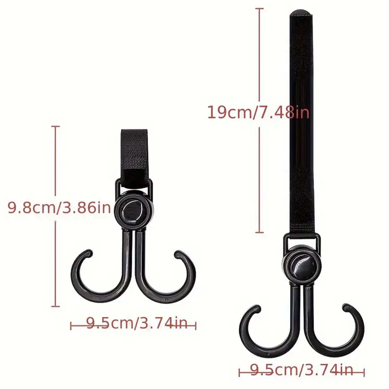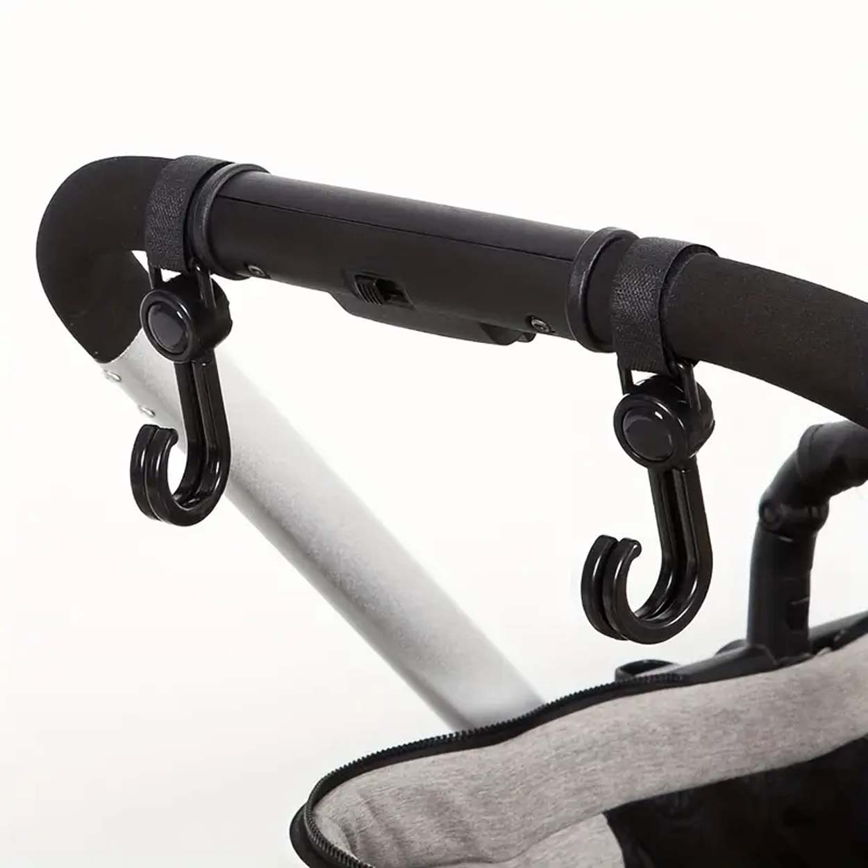 Barnvagnskrokar med kardborrefäste som gör det enkelt att hänga upp skötväska, matvarukasse eller andra tillbehör på barnvagnens handtag. Kardborrebandet träs runt handtaget och ger en snabb montering utan verktyg. Den dubbla kroken med karbinhake ger en praktisk upphängningspunkt och gör det lätt att flytta eller ta av det du hängt upp. Passar när du vill frigöra händerna och hålla ordning på saker under promenaden.